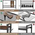 Shoe Rack for Front Door Entrance, 5 Tier Height-Adjustable Metal Shoe Rack , Sturdy Wooden Top and Tiltable Steel Frame Heavy Duty Shoe Organizer for Bathroom,Bedroom,Kitchen,Include Hook Organize Your Shoes: 5-Tier shoe rack, each shelf can hold 3-5 pairs of shoes, a total of 15-25 pairs of shoes to ensure your shoes are neatly arranged, the distance between the 4 mesh shelves is 8 inches to accommodate high heels and boots on the shelf. This shoe rack for entryway maximizes space utilization and simplifies organization, maintaining a tidy environment for you Adjustable Height and Tilt: The dimensions of the 5 tier shoe rack are: 29.1" wide * 11.8" deep * 38.7" high. The basic distance between each layer of the shoe rack is 8 inches. You can also adjust the height through the round holes on the side of the shoe shelf to meet your height requirements. At the same time, our shoe rack also supports angle tilt to adapt to your placement habits, making shoe storage easier and more convenient Strong Load-bearing Capacity: This metal shoe rack is made of high quality wood and metal mesh, the material is solid and textured, and has excellent corrosion resistance.Heavy duty shoe rack, to ensure that each layer can withstand a large weight and not easy to deformation, the top of the board smooth and thick can even carry the weight of a child, refusing to slack easy to fall apart of the ordinary wooden shoe rack Upgraded Design: This shoe organizer cabinet is equipped with a row of hooks, providing you with extra storage space for hanging umbrellas, keys, headphones, bags, hats, shopping bags, rackets, etc.; in addition, we increased the height of each compartment during production, which is more suitable for most types of shoes. The mesh surface of the compartment is also upgraded and encrypted to avoid the problem of high heels getting stuck. This shoe organizer provides additional thoughtful design to help maximize the use of limited space to meet your daily storage needs Easy installation: The shoe rack has a simple structure, is strong and durable, and is easy to disassemble and assemble. The number of layers of the shoe rack can be changed according to the size of the external space. It is practical and easy to use. The independent shoe rack is packaged with parts with clear instructions and labels. You only need to assemble it according to the instructions, and you can quickly get a complete shoe rack cabinet in 10 minutes Multi-purpose storage rack: This shoe rack is compact and takes up little space, making it an ideal storage rack for small spaces, perfect for the front door entrance or other corners. This shoe rack is not only suitable for shoes, but can also be placed in the bathroom, room, living room to store toiletries, paper towels, bags, towels, hats, books, storage boxes, potted plants, vegetables, kitchen tools, etc. The minimalist matte black frame is smooth and sturdy, and the retro brown surface is noble and exquisite, making this shoe rack a perfect match with your home decor