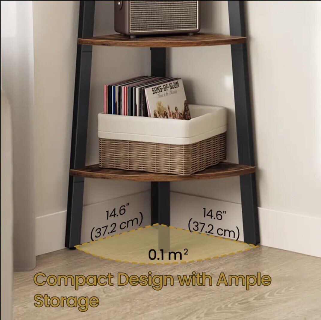 The 5-Tier Corner Shelf Stand is a stylish combination of rustic wood and black metal frame, perfect for storing books in the living room. This freestanding shelf requires no tools for assembly and has a metallic finish that adds a modern touch to any room. With five shelves of varying heights, this original piece from Guand is a functional and decorative addition to any home. Its open face design and flat pack packaging make it easy to transport and set up in your living space.