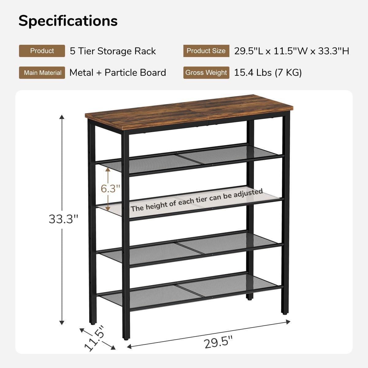Specifications: 5-Tier Shoe Rack Model: CHKSR201 Material: Black Metal + Particle Board Product Size: 29.5"L x 11.5"W x 33.3"H / 75cm(L) x 29.2cm(W) x 84.5cm(H) Gross Weight: 15.4 Lbs (7 KG) Tips: Please keep accessories away from children during installation. Children should not climb on or play with the product for safety reasons. [Multi-Function]: Classic retro industrial style design, adopting elegant rustic brown wooden board and black sturdy metal frame, like a piece of art. Wide applicability, large storage capacity, and maintaining a clean space. Application for different spaces of the entryway, hallway, closet, corner, cabinet, living room, bedroom, laundry room and garage. [Large Capacity Shoe Rack]: The size of the 5 tier shoe rack storage is 29.5"L x 11.5"W x 33.3"H / 75cm(L) x 29.2cm(W) x 84.5cm(H) , and holds up to 20 pairs of women's shoes or 15 men's shoes. (You can removable the metal mesh shelves and increase the height to store boots) [Adjustable Height]: The height of metal mesh shelves can be adjusted to store shoes or items of different heights. 4 adjustable footpads are designed for easy leveling on uneven, protected your tile and wood floors from scratches. [Solid & Stable]: This shoe rack is constructed of premium particleboard and metal mesh shelves, solid and stable, suitable for long-term use. [Easy To Assmble]: Comes with assembly instructions, assembly tools, easy to assembly.