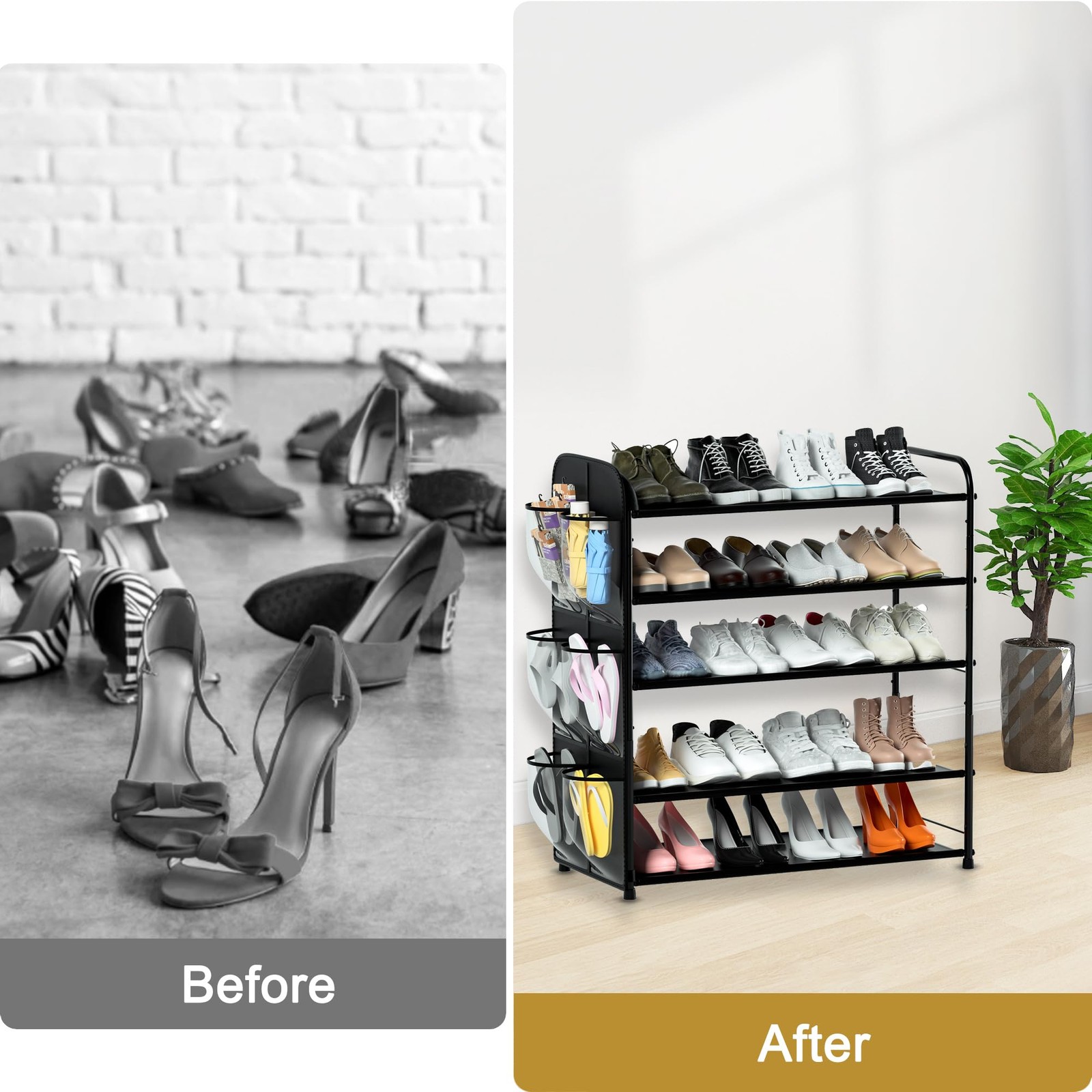 5 tier shoes rack is good solution for organizing your space of shoes. Durable shoe rack will meet you long term usage of shoes collection. Polyester shelves can hold every shoes size and keep your shoes in place. Measurement: 26.6’’L x 11.2’’ W x30’’ H Color: Black Package included: All the parts and detail instruction Check the shoes rack size before you place the order. Wipes clean with a damp cloth. Large Capacity Shoe Rack Shelf- This standing shoe rack for closet overall size is 26.6’’L x 11.2’’ W x30’’ H with 5 tier design. Tall and multi-layer design not only saves space but also provides large storage space, can holds 20 to 25 pairs of shoes. Flexibly Adjustable Shoe Shelf Height - The layers of the vertical shoe rack shelf can be disassembled and rearranged the height to friendly meet your various storage needs like storing long boots and high heels. Which is durable and convenient to use for cabinet closet, floor, corridor, narrow hallway, living room and garage. More Pockets for Storage - This black shoe organizer for closet is equipped with 1 side-pocket which has 6 storage space, more shoes or items could be put in it. Also the umbrellas or keys could be placed into the side pockets. Multifunctional Shoe Organizer - The ’ metal shoe rack for front door entrance can store sneakers, platform shoes, boots and high heels... And get a neat and organized hallway in the bargain. Durable & Sturdy- Our shoe rack is made of sturdy rust-proof metal pipes which has reliable strength and stability. Simple and elegant design with black powder coating, pairing perfectly with your modern or mid-century home space. Easy Assembly - Simple steps with detailed shoe holder instruction manual and easy to clean by wiping with a damp cloth. provides lifelong professional customer service. Any questions about the shoe rack, welcome contact us at anytime, we will try our best to help you!