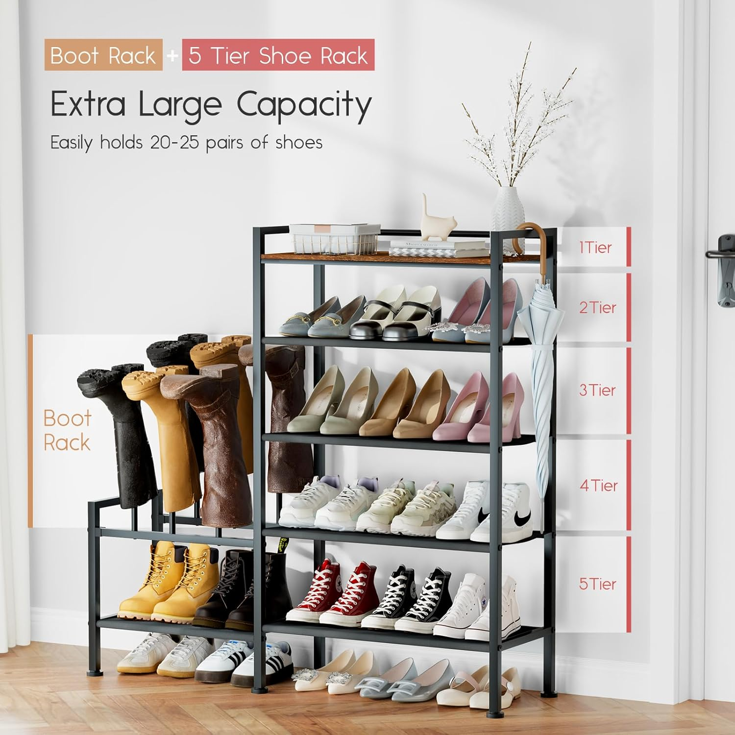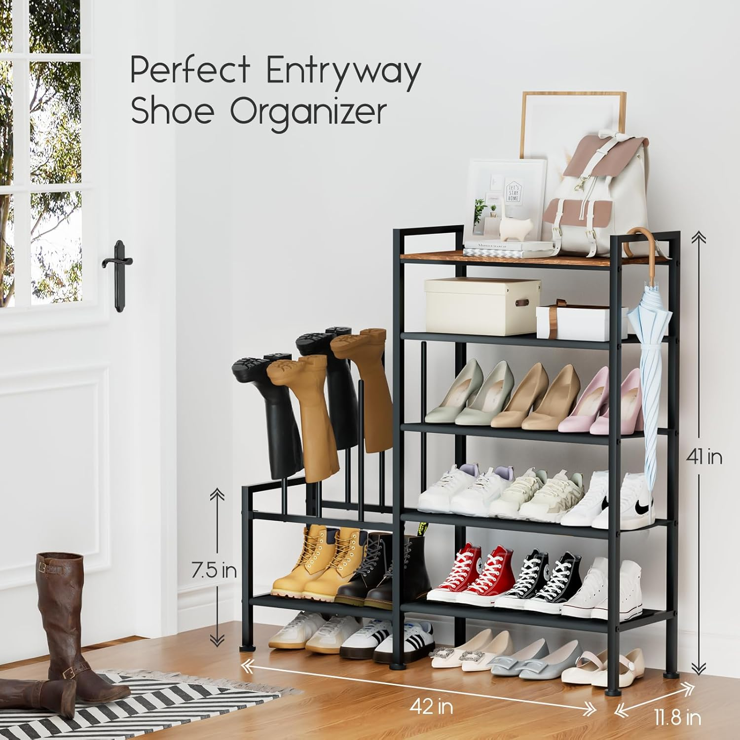 Store New Arrivals Add to Favorite View Feedback Contact Shoe Rack Organizer and Storage - 5 Tier Metal Shoe Rack with Boot Storage & Side Any Combination - Space Saving Shoe Shelf for Entryway, Bedroom, Closet, Garage, Small Spaces Description Style Modern Mounting Type Manually mounted Color Black Material Metal Country of Origin China Batteries Required? No Item Weight 13.04 pounds Shape Square Batteries Included? No Number of Shelves 1 Special Features Ventilation Special Feature Ventilation Product Dimensions 16.9"D x 12.2"W x 6.7"H Included Components Shoe Rack 1 Pack Heavy-Duty Metal Frame with Anti-Rust Coating: Designed for long-term use, this metal shoe shelf features a reinforced frame and rust-resistant coating. Each tier supports up to 40 lbs, ensuring strength and durability in busy households. Ideal for a garage shoe rack or hallway organizer Large Capacity Storage Up to 25 Pairs: This 5-tier shoe organizer for closet holds 20–25 pairs, from sneakers to high heels. Perfect for maximizing vertical space in small apartment storage or creating a tidy front door shoe rack for daily access Modular Boot Rack with Reversible Setup: This freestanding shoe rack features a modular design—its tall boot frame and standard tiers can be freely arranged on either left or right side, fitting various room layouts. Comes with a convenient side hook for umbrellas or bags. Perfect for customizing your closet organizer or entryway shoe storage Open Shelves with Breathable Fabric Layers: The open design and non-woven fabric layers allow airflow to keep shoes dry and odor-free. Great for humid areas or larger families. Use it as an indoor shoe rack, tall shoe storage, or closet shoe shelf Quick Installation + Anti-skid feet design: The entryway shoe organizer simple and uncomplicated installation steps, easy to assemble; Entrance shoe rack with non-slip feet to protect the floor and prevent the rack from swaying, easy to move freely between entryways, bedrooms and garages Product Description Entryway Bedroom Home Corner ABOUT US We offer the best prices around on high quality products. Our E-store includes media such as books, movies, music and games while offering electronics, toys, sporting apparel, clothing, tools, general home, garden items and more. SHIPPING We are always working hard to ensure your package arrives as soon as possible. Please understand that some factors like weather, high postal traffic, and the performance of shipping companies are outside of our control. We offer free shipping to the lower 48 states and ship within 2 business days of payment, usually sooner. We do not accept P.O. Boxes. Please provide a physical address. For shipping outside of the continental USA, we only use eBay's Global Shipping Program.The item is shipped to KY and then sent to the rest of the world. International customers are responsible for all duties and taxes. Continue to check out in order to calculate costs for shipping the item to your country. Messages regarding eBay's Global Shipping Program MUST be directed at eBay EXCLUSIVELY. RETURNS We offer a 30-Day Return Policy on items which you are not completely satisfied with. You have the option for a full-refund or an exchange of the item. No returns are available on items shipped outside of the USA. PAYMENT We accept PayPal. CONTACT US This page content is yet to come Please ad us to your favorite seller and visit again later Thank You CUSTOMER SATISFACTION We try our very best to make sure every customer is completely satisfied. If there's a problem, message us! We're happy to help.