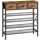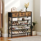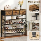 5-Tier Industrial Shoe Rack Tired of a cluttered entryway and a countertop piled with small items? The shoe rack solves the problem! Three non-woven fabric drawers keep small items organized, allowing you to find what you need before heading out. Fine mesh shelves and a spacious top maximize vertical storage, utilizing space efficiently in tight areas. This versatility rack doubles as a living room plant stand or a practical kitchen organizer. Blending style and functionality, it is the ideal addition to your home. Ample Storage with 3 Large Drawers: The shoe storage organizer features 3 non-woven fabric drawers, ideal for storing shoe polish, shoe horns, keys, gloves, and other small items, allowing for quick access before heading out and keeping your entryway clutter-free Efficient 5-Layer Design: Measuring 35.4"L x 11"W x 37.6"H, the entryway shoe rack organizer maximizes vertical space with 4-tier metal mesh shelves and 1 wooden countertop, holding approximately 4-5 pairs of shoes per shelf, fulfilling storage requirements Versatile Shelving Unit: Designed with a vintage industrial style, this rustic shoe rack with drawer blends classic and modern aesthetics and serves as a shoe rack for front door entrance, plant display shelf, or kitchen organizer, adapting seamlessly to various settings to enhance your space High-Quality Materials for Durability: Our shoe rack for closet is crafted from quality particleboard and sturdy metal, with X-shaped metal bars on the sides for enhanced stability. The fine mesh of the shoe stand prevents heels from getting stuck, ensuring a better user experience Simple Installation Process: All parts of the shoe shelf are labeled with numbers and come with a detailed instruction manual and necessary tools. Follow the guidelines to effortlessly assemble the shoe organizer. Please use anti-tip devices for steadiness of the wooden shoe rack with drawers
