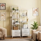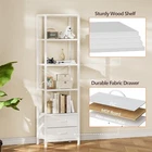 5-Tier Corner Shelf, Narrow Bookshelf with 2 Storage Drawers, Tall Bookcase, Standing Shelf Organizer Unit for Living Room, Bedroom, Metal Frame, Wood Display ShelfWhite 5-Tier Shelf & 2 Drawers: This bookshelf features multiple wood shelves to accommodate books, decor, and other items. The functional fabric drawers provide additional storage space for your personal items or office supplies, keeping your space organized and clutter-free. Space Saving & Utilizing: The tall and narrow design of this wall shelf allows you to make the most of vertical space, making it perfect for rooms with floor area. It efficiently utilizes unused wall space without sacrificing storage capacity, bringing you the convenience and functionality. Stable & Durable: This tall shelf is composed of wear-resistant wooden shelves and hard steel frame, which is crafted with high-quality materials for durability and long-lasting use. The solid construction ensures stability, making it a reliable storage solution for s to come. Easy to Assemble: With its user-friendly construction, assembling this bookshelf is a breeze. The package includes all the necessary hardware and clear instructions, SATISFACTION GUARANTEEing a hassle-free setup process. Multiple Functions: This shelf combines display and storage functions, making it suitable for different rooms and scenes. It can be used as a bookcase in the bedroom, office, or a corner shelf in the living room, storing room, or a standing shelf in the kitchen, bathroom.
