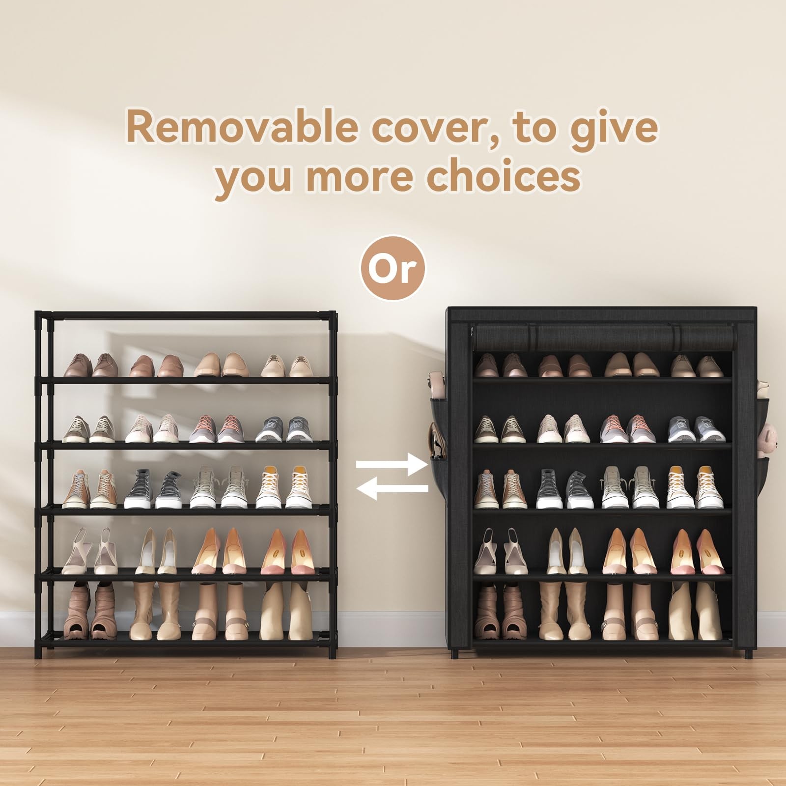About Entryway Shoe Rack with Cover: Large Capacity : Our 6 tier shoe rack provides you with enough storage space, can hold up to 20-24 pairs of shoes, keeping your room tidy and clutter-free. Removable Shoe Rack: This shoe storage organizer adopts detachable design, one layer can also be removed to accommodate different types of shoes, whether high heels, sneakers or sandals, they can be easily stored. It is an excellent closet shoe rack for storing shoes. Enclosed Shoe Rack: This corner shoe rack with covers to prevent dust and keep your shoes away from dust. The fabric cover is breathable, keeping your shoes fresh and dry. In addition, the fabric cover is detachable and there are two ways to use a shoe rack for closet for you to choose from. Tall Shoe Rack with 4 Pockets: our shoe rack covered is equipped with 4 pockets, which can be equipped with small accessories such as ties, belts, sunglasses, etc. This shoe rack for entryway provides you with a variety of storage, very practical. Suitable for Any Place: The unique and simple design sneaker storage shoe rack is ideal for storage in closet, entryway, dorm, bedroom, corner, garage, living room, doorway, hallway, porch and other places, adding novel color to your home, make your home more comfortable and warm. Front Door Shoe Rack Specifications: Color: Black Covers + Balck Metal Frame Material: Metal Tube, Non-Woven Fabric, Plastic Connector Closet Shoe Rack Size: 33.8"D x 9.8"W x 40"H Shoe Closet Organizer Distance Between Shelves: 7.8 in Garage shoe rack Max. Static Load Capacity per Tier: 10 lb (3 kg) Portable Shoe Rack Organizer Package Contents: 1 x Stackable Shoe Rack 1 x Shoe Cabinet Storage Assemble Instructions Holds a Lot of Shoes: Dimensions of large shoe rack is: 33.8"D x 9.8"W x 40"H, can be storage for 20-24 pairs of shoes. 5 tier shoe rack provides you with ample storage space, whether it's boot, high heel, sneaker or sandal, they can all be easily stored Detachable and Stackable: The distance between the layers of this shoe stand is 7.8 in, suitable for all types of shoes. And you can also remove a layer and adjust the layer distance of the shoe closet to fit bigger shoes, can also stack 2 shoe rack for use Sturdy Shoe Rack: This closed shoe rack is made of sturdy metal frame, durable non-woven fabric and premium connectors, strong and durable enough. Each tier of this covered shoe rack supports up to 10 lb, easily carry your shoes and maintain stability Shoe Rack with Dustproof Cover: This shoe rack organizer has a cloth cover design, and the cover that keeps dust and pet out, ensuring that they stay clean. And the cloth cover is breathable, to keep your shoe fresh and dry, perfect for long-term shoe storage Space Saver Shoe Rack: This free standing shoe racks, takes advantage of vertical space, only takes up little space, perfect fit for small space, such as closet, entryway, dorm, bedroom, garage, hallway, front of door, living rooms, laundry room etc Easy to Assemble: The assembly of this vertical shoe rack is very simple, not require any tools, just follow the steps in the instruction manual to complete the assembly. And the stackable shoe rack details page provides an assembly video for your reference