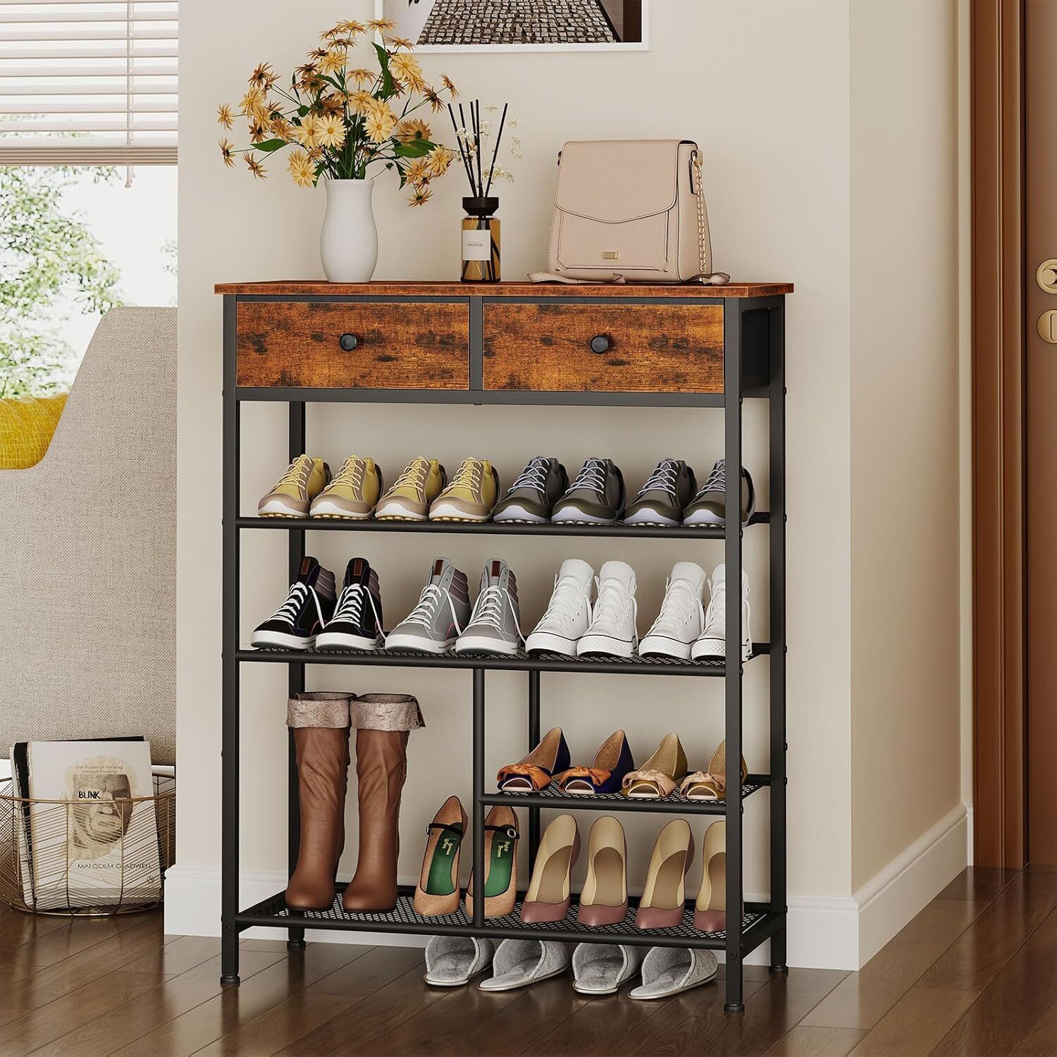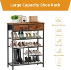 Ample 5-Tier Storage: Measuring 29.9 x 11.8 x 38.0 inches, organize your footwear effortlessly with our spacious 4-tier shoe rack, designed to accommodate a wide variety of shoe types, ensuring a clutter-free entryway or closet Versatile Shoe Storage: Perfect for everything from sneakers to stilettos, our rack includes a dedicated area specifically designed for boots, keeping all your footwear neatly arranged and easily accessible Enhanced Organization with Fabric Drawers: Includes two fabric drawers to store accessories, socks, or other small items, enhancing the functionality of your storage solution and keeping your space tidy Sturdy Metal Shelves: Built with sturdy metal shelves that provide reliable support and stability, ensuring long-lasting use while maintaining a sleek and modern look Space-Efficient Design: Maximize your storage capacity without sacrificing floor space, making it an ideal solution for apartments, dorms, or any living area in need of a little extra organization