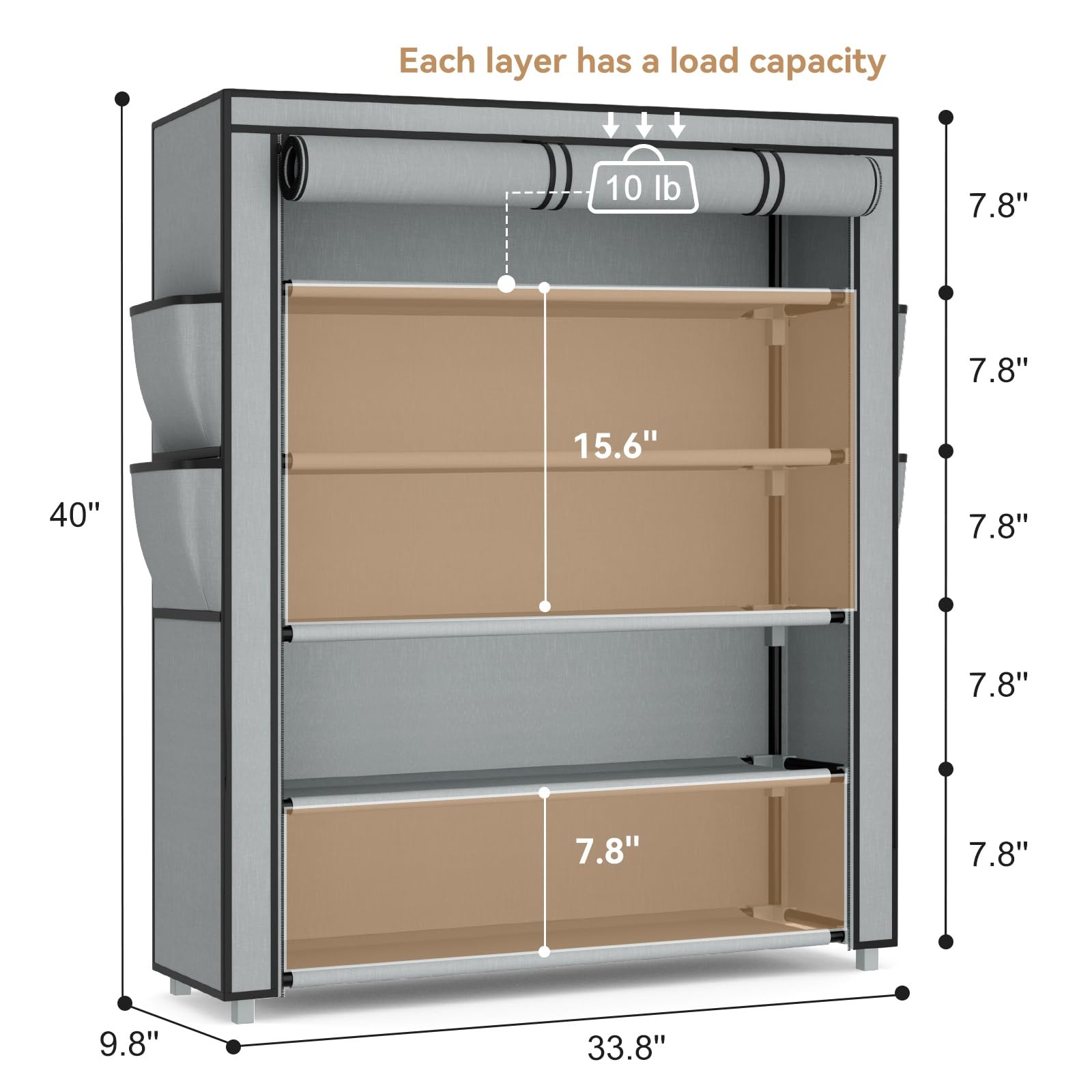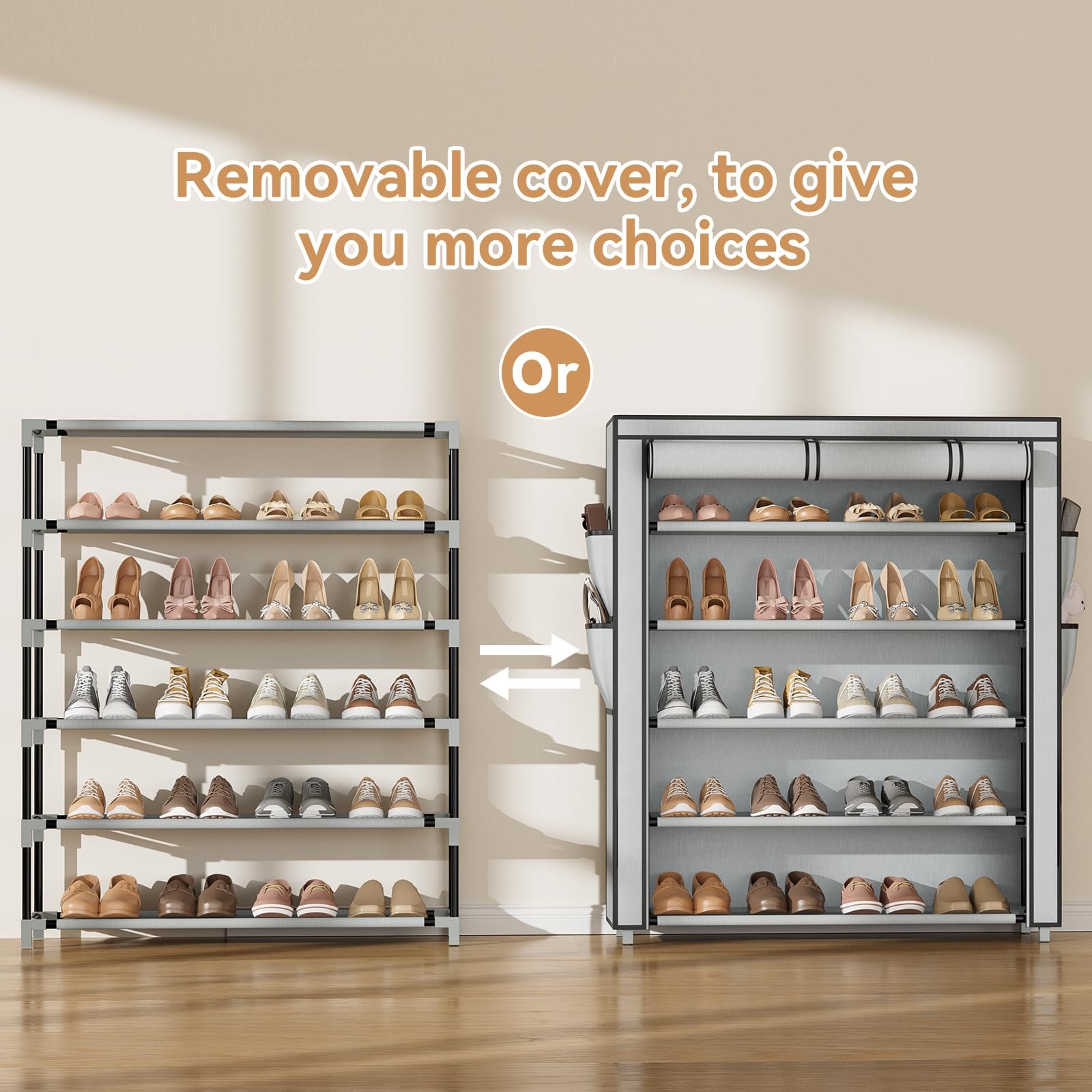 About Entryway Shoe Rack with Cover: Large Capacity : Our 6 tier shoe rack provides you with enough storage space, can hold up to 20-24 pairs of shoes, keeping your room tidy and clutter-free. Removable Shoe Rack: This shoe storage organizer adopts detachable design, one layer can also be removed to accommodate different types of shoes, whether high heels, sneakers or sandals, they can be easily stored. It is an excellent closet shoe rack for storing shoes. Enclosed Shoe Rack: This corner shoe rack with covers to prevent dust and keep your shoes away from dust. The fabric cover is breathable, keeping your shoes fresh and dry. In addition, the fabric cover is detachable and there are two ways to use a shoe rack for closet for you to choose from. Tall Shoe Rack with 4 Pockets: our shoe rack covered is equipped with 4 pockets, which can be equipped with small accessories such as ties, belts, sunglasses, etc. This shoe rack for entryway provides you with a variety of storage, very practical. Suitable for Any Place: The unique and simple design sneaker storage shoe rack is ideal for storage in closet, entryway, dorm, bedroom, corner, garage, living room, doorway, hallway, porch and other places, adding novel color to your home, make your home more comfortable and warm. Front Door Shoe Rack Specifications: Color: Grey Covers + Balck Metal Frame Material: Metal Tube, Non-Woven Fabric, Plastic Connector Closet Shoe Rack Size: 33.8"D x 9.8"W x 40"H Shoe Closet Organizer Distance Between Shelves: 7.8 in Garage shoe rack Max. Static Load Capacity per Tier: 10 lb (3 kg) Portable Shoe Rack Organizer Package Contents: 1 x Stackable Shoe Rack 1 x Shoe Cabinet Storage Assemble Instructions Holds a Lot of Shoes: Dimensions of large shoe rack is: 33.8"D x 9.8"W x 40"H, can be storage for 20-24 pairs of shoes. 5 tier shoe rack provides you with ample storage space, whether it's boot, high heel, sneaker or sandal, they can all be easily stored Detachable and Stackable: The distance between the layers of this shoe stand is 7.8 in, suitable for all types of shoes. And you can also remove a layer and adjust the layer distance of the shoe closet to fit bigger shoes, can also stack 2 shoe rack for use Sturdy Shoe Rack: This closed shoe rack is made of sturdy metal frame, durable non-woven fabric and premium connectors, strong and durable enough. Each tier of this covered shoe rack supports up to 10 lb, easily carry your shoes and maintain stability Shoe Rack with Dustproof Cover: This shoe rack organizer has a cloth cover design, and the cover that keeps dust and pet out, ensuring that they stay clean. And the cloth cover is breathable, to keep your shoe fresh and dry, perfect for long-term shoe storage Space Saver Shoe Rack: This free standing shoe racks, takes advantage of vertical space, only takes up little space, perfect fit for small space, such as closet, entryway, dorm, bedroom, garage, hallway, front of door, living rooms, laundry room etc Easy to Assemble: The assembly of this vertical shoe rack is very simple, not require any tools, just follow the steps in the instruction manual to complete the assembly. And the stackable shoe rack details page provides an assembly video for your reference