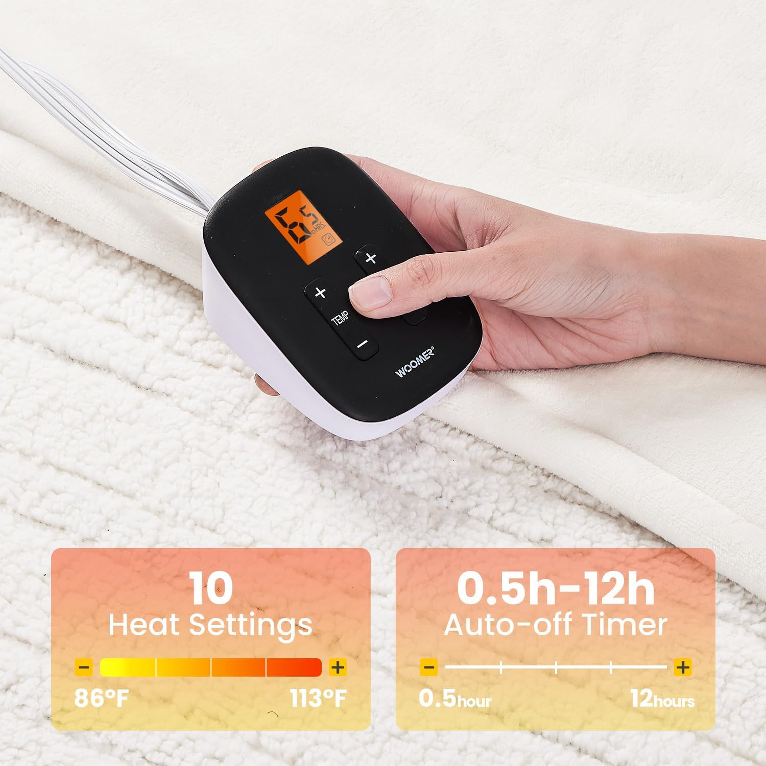 Store New Arrivals Add to Favorite View Feedback Contact [5-Year Warranty] Electric Blanket Full Size,Durable Flannel and Soft Sherpa,Dual Control,77”×84” Heated Throw Blanket, 10 Heat Levels&0.5-12H Auto-Off,Energy Efficient,Etl Certified Description Style Modern Number of Items 1 Pattern Solid Country of Origin China Blanket Form Throw Blanket Theme Plain Product Dimensions 76.77"L x 83.86"W Material Flannel Age Range (Description) Adult Seasons All Included Components Power Cord, Controller Water Resistance Level Not Water Resistant Item Weight 6.53 pounds Fill Material Flannel Special Feature Corded Fabric Warmth Description Heavyweight Color White Recommended Uses For Product Reading, Napping, Camping, Travel Sport Camping Fabric Type 50%flannel 50%sherpa Product Care Instructions Machine Wash Size Full Size 77" × 84" Top-notch Double-sided Materials: Crafted from a blend of flannel and sherpa, this full size (77”×84”) heated blanket boasts a thin, breathable design with a 4mm short fur. Its smooth, soft feel against the skin ensures maximum coziness Adjustable Heat and Timer: Easily select from 10 heat levels (86°F to 113°F) using the controller. Set a timer from 0.5 to 12 hours for customized warmth. The 19-foot cord ensures maximum flexibility Efficient Heating Technology: Our twin size electric blanket (77”×84”) features innovative U-shaped heating wires for even warmth distribution. Stay comfortably warm in any season Safety Assured: ETL certified for safety, our Woomer heated blanket includes over-heating protection and an Auto-Off timer for worry-free sleep Hassle-Free Purchase: Enjoy reliable and warm after-sale service on our electric blanket, with assurances of prompt responses to all inquiries Product Description One Button Easy Control Use the controller to easily switch between the 10 heat levels from 86℉ to113℉ and set 0.5h -12h auto-off reservation. Fast Heat & Energy-Saving Adopts upgraded double layer heating wires to ensure efficient safe, fast and even heating. Long Cord 9ft long power cord allows you to conveniently reach power outlets anywhere in the room. Reliable and Caring We promise 5-year repair or exchange on our products plus 30-day return for the most comprehensive service. 1 Warm Plus 2 Giftable 3 Machine Washable Woomer Reversible Heated Blanket Fabric Front Breathable Flannel Fabric Front Aesthetic Faux Fur Fabric Front Durable Flannel Fabric Rear Soft Sherpa Fabric Rear Fuzzy Sherpa Fabric Rear Cozy Velvet Feature Breathable, providing extra warmth and comfort Feature Not only cozy but also a stylish addition to your home decor Feature Skin-friendly,breathable, cozy and warm ABOUT US We offer the best prices around on high quality products. Our E-store includes media such as books, movies, music and games while offering electronics, toys, sporting apparel, clothing, tools, general home, garden items and more. SHIPPING We are always working hard to ensure your package arrives as soon as possible. Please understand that some factors like weather, high postal traffic, and the performance of shipping companies are outside of our control. We offer free shipping to the lower 48 states and ship within 2 business days of payment, usually sooner. We do not accept P.O. Boxes. Please provide a physical address. For shipping outside of the continental USA, we only use eBay's Global Shipping Program.The item is shipped to KY and then sent to the rest of the world. International customers are responsible for all duties and taxes. Continue to check out in order to calculate costs for shipping the item to your country. Messages regarding eBay's Global Shipping Program MUST be directed at eBay EXCLUSIVELY. RETURNS We offer a 30-Day Return Policy on items which you are not completely satisfied with. You have the option for a full-refund or an exchange of the item. No returns are available on items shipped outside of the USA. PAYMENT We accept PayPal. CONTACT US This page content is yet to come Please ad us to your favorite seller and visit again later Thank You CUSTOMER SATISFACTION We try our very best to make sure every customer is completely satisfied. If there's a problem, message us! We're happy to help.