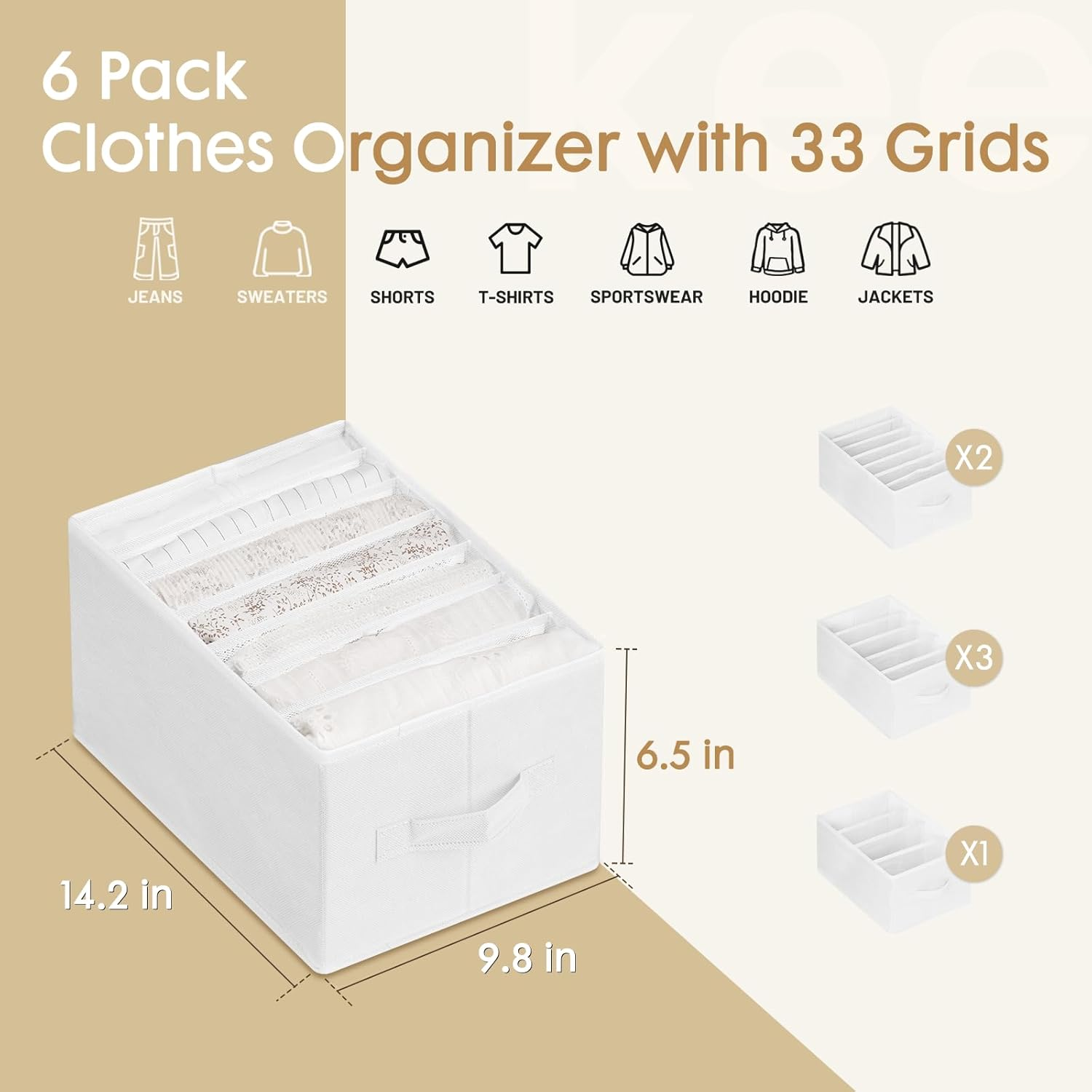 Each closet organizer measures 14.2"L x 9.8"W x 6.5" H. Sturdy Structure, Collapsible and Lightweight, Easy to Clean. Large Capacity: Compared to other products on the market, our 6 Pack Wardrobe Clothes Organizer Set has 33 grids for a variety of storage needs. Perfect for organizing pants, leggings, sweaters, hoodies, shirts, skirts, scarves, large bras, towels, children's clothing, and more. Dividers help keep items organized and make it easy to access the clothes you need. Especially suitable for closets, bookshelves, and closets Sturdy Structure: Sturdy construction with superb stitching. The cardboard attached to the bottom can make the clothes organizer firm and not easy to collapse, providing enhanced durability and stability, keeping clothes well stored in the organizer and accessible at all times Partition Design: There are 33 grids in total. 1 pcs of 4 grids, 3 pcs of 5 grids and 2 pcs of 7 grids. Different numbers of grids can meet your needs for different clothes storage. 4 grid design is suitable for sweaters, jackets, bath towels, etc. 5 grid design is suitable for pants, hooded sweatshirts, dresses, etc. 7 grid design is suitable for shirts, shorts, oversized underwear, etc Simple Setup: The clothes organizer just open and insert the bottom to be ready for use, no tools required. When not in use, simply take out the bottom and fold flat Versatile Storage: Multi-purpose organizer can be used to organize sweaters, pants, towels, t-shirts, bath towels, hooded sweatshirts, shirts, etc. in the nursery, RV, closet, living room, dorm room, or office. Free up more storage space and save your valuable time Product Description Criusia‘s 6 Pack Foldable Fabric Wardrobe Clothes Organizer Our Closet Organizer Will Keep Your Room Tidy, Saving Your Time and Space 6 Pack Clothes Organizer with 33 Grids, 3 Different Grids, Meet Your Need Non-woven Fabrics Breathable non-woven fabric is used. Cardboard backing is sturdy and anti-tear. Foldable Organizers When not in use, you can pull out the bottom board and fold it flat to save space. With 2 Handles Convenient to pull it out from your closet, shelf, wardrobe, drawer, easy to take and store clothes. More details about Criusia's 6 Pack Closet Organizers for Pants, T-shirt, Sweaters, Coat, Towels 1 Non-woven Fabrics 2 Easy to Assemble 3 With 2 Handles High Quality Material is Used, Also Safe for Baby's Clothing, Toys... More Product Add to Cart Add to Cart Add to Cart Add to Cart Add to Cart Add to Cart Customer Reviews 4.6 out of 5 stars 58 4.8 out of 5 stars 50 4.6 out of 5 stars 58 4.8 out of 5 stars 50 4.6 out of 5 stars 58 4.8 out of 5 stars 50 Price $29.99 $ 29 . 99 $43.99 $ 43 . 99 $24.99 $ 24 . 99 $43.99 $ 43 . 99 $43.99 $ 43 . 99 $43.99 $ 43 . 99 item count 10 PACK 8 PACK 10 PACK 8 PACK 10 PACK 8 PACK Material Non-woven fabric, PP board Non-woven fabric, PP board Non-woven fabric, PP board Non-woven fabric, PP board Non-woven fabric, PP board Non-woven fabric, PP board Tear-resistant ✔ ✔ ✔ ✔ ✔ ✔ Sturdy ✔ ✔ ✔ ✔ ✔ ✔ Odorless ✔ ✔ ✔ ✔ ✔ ✔