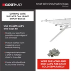 1/4 in. Nickel Shelf End Caps for Ventilated Wire Shelving (60-Pack) Designed to slide onto the rough ends of wire shelving to protect clothing, walls, and the wire shelving itself, ClosetMaid's vinyl end caps also provide a finished look to your wire shelving. Compatible with ClosetMaid's SuperSlide, Shelf and Rod, and Close Mesh shelving types. Includes twenty end caps to cover the sharp edges of two wire shelves. Twenty small vinyl caps for covering the wire ends of ClosetMaid shelving, enough for two shelves End caps protect wire shelves from wear, prevent injuries, and create a finished look Soft vinyl protects clothing from snagging on rough edges of wire shelving Prevents scratching when shelves are installed close to walls Durable vinyl in a nickel finish Easy to install with no tools required - simply slide caps right onto shelving wire ends Compatible with ClosetMaid's SuperSlide and Shelf and Rod linen wire shelving as well as ClosetMaid Close Mesh wire shelving