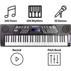 The Keyboard Piano Super Kit includes a 61-key keyboard, a keyboard stand, a keyboard bench, and a pair of high-quality over-ear headphones all in one box. The 61 key keyboard piano has the latest chipset (2020) that provides you with the highest quality sound output and functionality including 200 tones, 200 rhythms & 40 Demo songs that are all played through the two integrated stereo speakers. It also has USB and AUX inputs that allow you to play along with your favorite songs via any mobile device or USB stick (MP3) through the keyboard itself. This keyboard can be powered by both batteries (6 x 1. 5V Size D batteries) and main power (Mains power adapter included) so it can be used both portably and in the home. To accompany all of the above the keyboard piano has a record and playback function (46 note memory, ) three teaching modes, metronome, split keyboard mode, sustain and transpose are all easily accessible from the clear LED display on the keyboard. To complement this high-performance keyboard is a durable and stable keyboard bench, a keyboard stand and high quality over the ear headphones so you can practice in privacy without disturbing others. For the budding musician, this package also includes access to exclusive content within the Simply Piano application (IOS & Android) which means you can be playing along to your favorite songs in minutes. TakeLessons also provides you with face to face and group lessons. The 5061 keyboard piano super kit includes a digital keyboard with 61 full-size keys giving you that traditional piano feel whilst maintaining a portable and compact design that can be powered by either mains (power supply included) or batteries This 5061 piano keyboard features a LED panel that both displays and engages the 200 rhythms, 200 tones, a teaching function, and 30 demo songs that are part of its functionality The 5061 electric piano has record and playback functionality allowing you to build layers to your sound and an aux input so you can play along to your favorite songs This music keyboard super kit package includes a keyboard stand that is sturdy in design and can be adjusted to suit keyboard piano players both young and old This electric piano keyboard super kit contains a padded seat that is easily folded and has a thick padded seat for hours of comfortable play