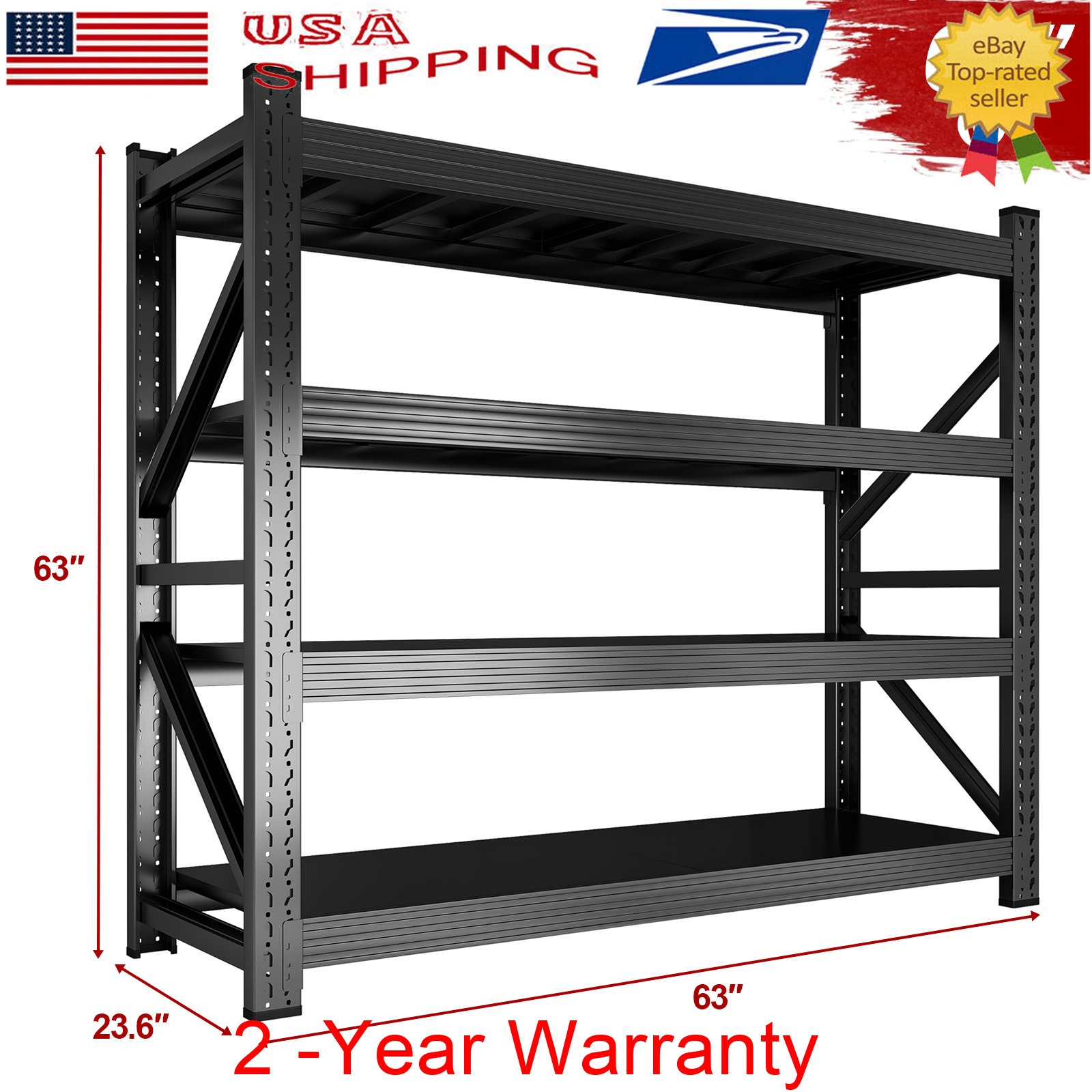 63" Garage Shelving Heavy Duty 4 Tier Storage Shelves Metal Organizer Rack USA Product Description Say goodbye to wobbling shelves and weak joints. Our Garage Shelving features four one-piece steel columns, thick steel shelves reinforced with ribs, and extra-wide beams for superior durability and strength. It’s perfect for storing tires, generators, tools, and more. Adjustable shelf heights let you create the setup you need, while the quick, 10-minute installation makes organization effortless. About this item 【Heavy Duty Garage Shelving Load 6000LBS 】Designed to handle even the toughest storage challenges. With a total weight capacity of 6000 lbs and 1500 lbs per shelf, this shelving unit is built to withstand heavy-duty use. Featuring one-piece columns, dual Reinforcing Diagonal Supports, reinforced Steel shelves with three support ribs, and extra-wide beams, it offers unparalleled strength and durability. 【One-Piece Columns with Diagonal Supports 】No seams, no weak spots. Our four one-piece columns, reinforced with diagonal supports, are the key to a sturdier, more reliable garage shelves. The seamless design, combined with the diagonal braces, eliminates wobbling and sagging, offering enhanced stability and durability for heavy-duty storage., unlike split column garage shelf that can suffer from weak joints and instability. 【Thick Steel Shelving with Reinforcement Rib】Our shelf’s thick steel shelves, reinforced with ribs and supported by extra-wide beams, provide unmatched durability for all your storage needs. The reinforced ribs help spread the weight evenly across each shelf, while the extra-wide beams ensure maximum load-bearing capacity, preventing any bending or sagging over time. 【Adjustable Metal Shelf】Our heavy duty shelving features adjustable shelves, allowing you to create the perfect storage system for your unique needs. Adjust the height of each shelf to fit everything from large appliances to smaller tools, and enjoy a customizable storage experience. Whether it’s for home or commercial use, this shelving unit is versatile and practical. 【Garage Shevleing with Monster Storage Space】This extra-wide garage shelving is perfect for garages, warehouses, basements, and shops. It’s not just for home use – this shelving unit is also ideal for industrial and commercial applications. Perfect for storing heavy-duty items like tires, generators, and motor oil crates, it's built for mechanics, warehouse professionals, and anyone who needs reliable, heavy-duty storage. 【10-Minute Solo Assembly】We’ve simplified assembly with a comprehensive installation guide and clearly labeled parts for each step. And if you run into any issues, our professional customer service is always ready to offer guidance and support, ensuring a flawless experience. Product Sizes 1PCS --- 4 Tier - 63" W x 24" D x 63" H