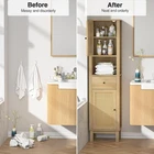 Product Description About this item Distinctive Style: This natural rattan bathroom storage cabinet creates a bohemian vibe with the charm of mid-century modern design. Add a touch of nature to your home to create a calm, cozy atmosphere. The simple elegance of this tall storage cabinet blends easily with a variety of furniture and decor styles. Flexible Storage Space: This bathroom storage cabinet include 1 drawer, 1 open space,2 door cabinet, 2 adjuatable shelves.Its ample storage space and compact design make it a perfect fit for any room—whether in the bathroom, kitchen, dining room, or living room. Keep your space neat and organized with ease. Sturdiness: Made of high-quality engineered wood, this tall rattan storage cabinet features durable solid wood legs for both style and stability. The base provides ample space for easy cleaning. The top is equipped with an anti-tip device to ensure maximum safety and stability. Perfect for Small Spaces: this narrow yet tall cabinet offers tons of storage yet takes up little space, perfect for small areas in your bathroom or any other tight corners in your home Assemble: This tall storage cabinet is designed to be need to assemble and comes with detailed instructions and tools. Overall dimensions: 11.8"L x 15.7"W x 62.99"H. If you have any questions, please contact us in time and we will solve all problems for you Previous page Next page Additional Drawers Store and hide your small belonging items Adjustable shelf You can freely adjust the shelves according to the height of your items to meet your different storage needs Magnetic door High quality magnetic door catch prevents the door from swinging back and forth after closing Oval handle Oval handles help you open doors and drawers more easily