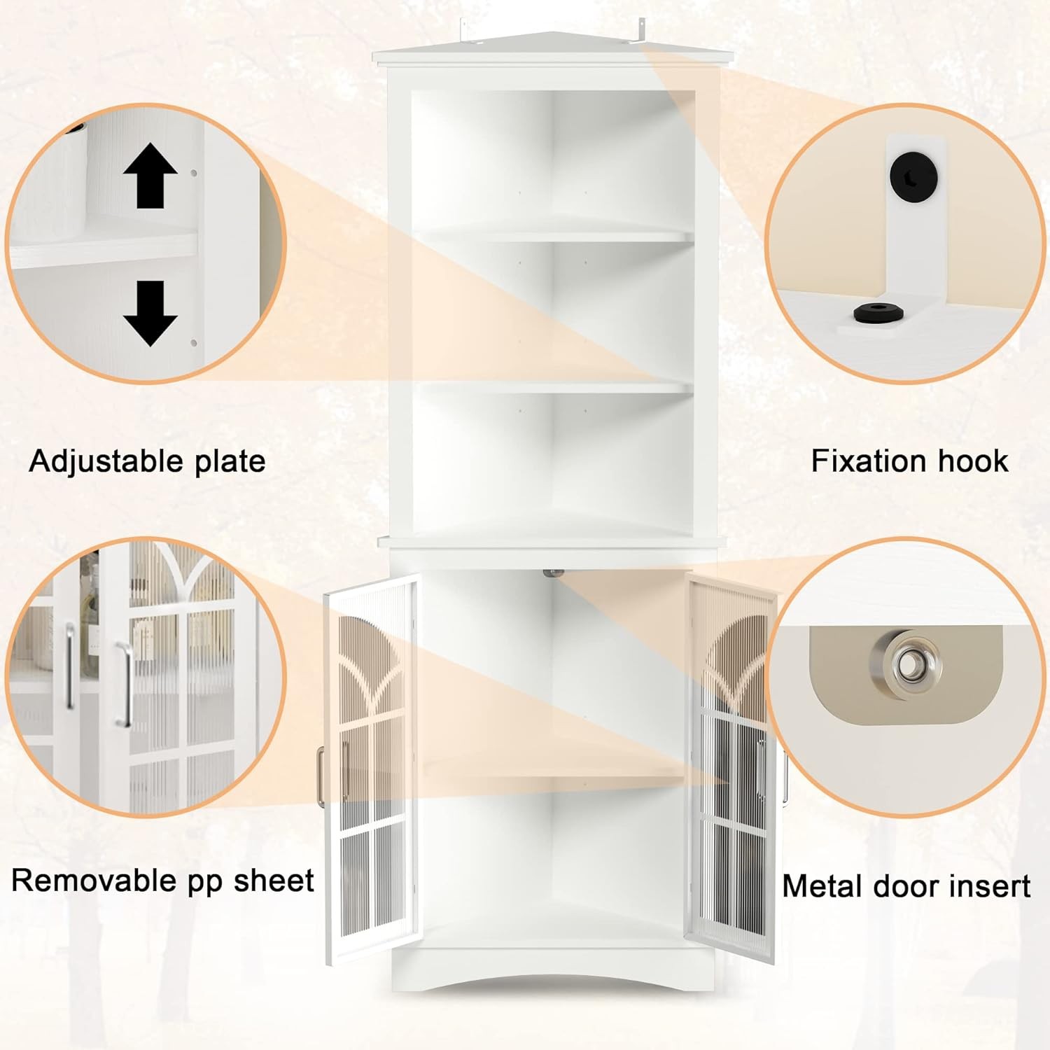 Product Description Features: corner cabinet maximizes the expanded storage space. Tall corner cabinet with 3-tier open shelves & 1 adjustable board inside door freely storage for displays, necessaries, and sundries. 90° right angle in the rear of the storage cabinet fits well with the wall. More and more people chose it as a corner storage shelf for the bathroom, living room, bedroom, and hallway. Constructed of environmentally durable MDF to storage cabinet with a long life span. Adding 2 anti-tipping secure bands behind the storage cabinet guarantee safety and stability. The elegant appearance, antiqued glass cabinets, and clean lines show rustic features. Besides this, the tall cabinet is changeable for various styles, bookcases/storage cabinets/display shelves/buffet cupboards. About this item corner cabinet maximizes the expanded storage space. Tall corner cabinet with 3-tier open shelves & 1 adjustable board inside door freely storage for displays, necessaries, and sundries. 90° right angle in the rear of the storage cabinet fits well with the wall. More and more people chose it as a corner storage shelf for the bathroom, living room, bedroom, and hallway. Constructed of environmentally durable MDF to storage cabinet with a long life span. Adding 2 anti-tipping secure bands behind the storage cabinet guarantee safety and stability. The elegant appearance, antiqued glass cabinets, and clean lines show rustic features. Besides this, the tall cabinet is changeable for various styles, bookcases/storage cabinets/display shelves/buffet cupboards. On Aug 17, 2025 at 19:21:22 PDT, seller added the following information:
