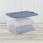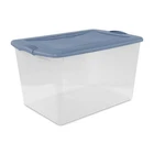 Keep your space organized with the versatile Sterilite 66 Quart Latch Box, featuring secure latches that keep the lid attached to the base, yet are still easy to unlatch. The clear base and lid allow contents to be easily identified from any angle, and multiple Latch Boxes are able to stack neatly on top of each other. This latching storage box is ideal for storing off season clothing, sporting equipment, boots, blankets and other bulky items around the home. The indexed lids allow same size storage boxes to stack neatly on top of each other to use vertical storage space efficiently. The overall assembled dimensions of this item are 24" L x 16" W x 13 7/8" H. Sterilite Adult Plastic 66 Qt. Latch Box Blue Moonlight Outside Dimensions: 24" x 16" x 13 7/8" Interior Dimensions at bottom: 19 1/2" x 13 1/8" x 13 1/8" Clear lid and base for easy identification of contents from any angle Contemporary styling and shape to provide solutions to a variety of household storage needs Colorful latches secure lid to base, keeping contents safely stored inside Indexed lids allow for storage boxes to stack neatly on one another BPA-free and phthalate-free