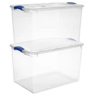Step up to versatile 66 Quart Clear Latching Storage Bin and get organized! The clear base and lid let you easily view and locate stored contents from any angle. The color accent latches keep the lid attached to the base, to keep items contained. The recessed lids help bins stack neatly for efficient use of vertical space. This popular size plastic storage container is perfect for clothing, blankets, boots, off-season gear, and bulky items. This is the ideal solution for a variety of storage challenges, helping to bring order to closets, bedrooms, craft rooms, and dorms! 66 Quart Latch Box, Clear Plastic Storage Bin with Lid, Blue Latch, 6 Count Outside Dimensions: 24" x 16" x 13 7/8" Interior Dimensions at bottom: 19 1/2" x 13 1/8" x 13 1/8" Clear lid and base for easy identification of contents from any angle Color accent latches keep lid secure and contents in place Recessed lids allow bins to stack neatly to maximize vertical storage space, and the 32 Qt and 66 Qt bins use the same size lid allowing both the shallow and deep sizes to be stacked in same footprint Use good judgment when stacking items, keep heaviest bin at the bottom BPA-free and phthalate-free