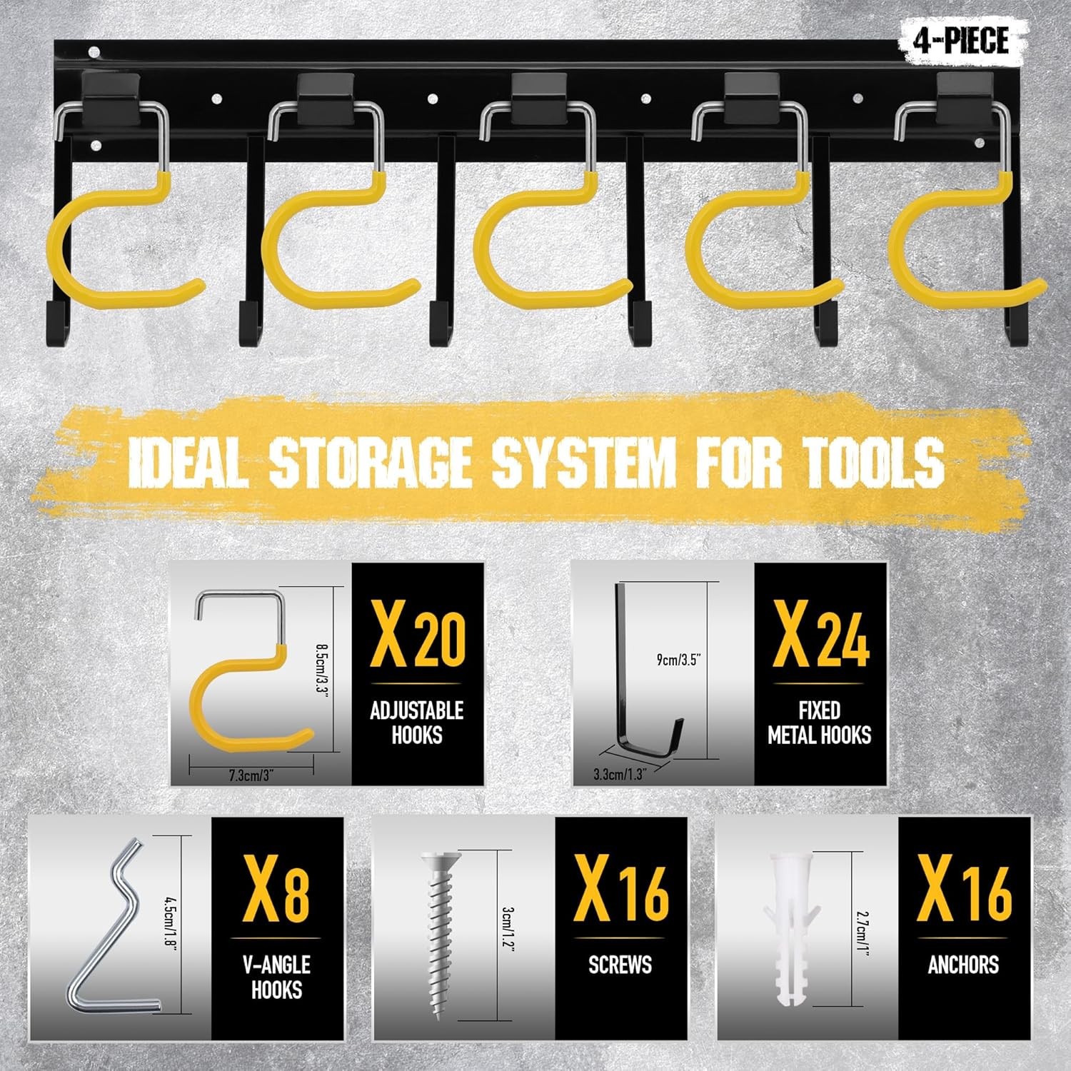 ALL-METAL DURABILITY - Built entirely from iron, this garden tool organizer boasts exceptional strength and stability. Unlike typical ABS hooks, our heavy-duty garage storage solution withstands the weight of shovels, rakes, and more without bending or breaking. VERSATILE ORGANIZATION - This all-in-one garage tool organizer features 20 adjustable, non-slip coated hooks, 24 fixed metal hooks, and 8 V-angle hooks, accommodating a wide range of tools such as mops, brooms, shovels, and rakes. With 16 heavy-duty screws and 16 durable dowels, it ensures stability and keeps your space tidy and accessible. ADJUSTABLE DESIGN - The garage tool organizer wall mount comes with adjustable hooks that can be easily repositioned to fit your needs. Perfect for organizing various tools, it adapts to different sizes and shapes, providing flexible garage storage solutions. LONG-LASTING RUST PROTECTION - Designed for both indoor and outdoor use, this garage organizer features anti-corrosion coating to withstand harsh conditions. Enjoy a tool organizer that resists rust and aging, ensuring long-lasting performance in any setting. EASY INSTALLATION - Quickly set up your garage tool organizer wall mount with included ABS nails, screws, and dowels. This garage organizer installs securely on any wall, making setup a breeze and saving valuable time. Product Description