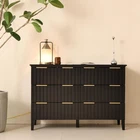 6 Drawer Dresser for Bedroom Black Fluted Wooden Dresser Tall Chest of Drawers with Double Golden Handles Modern Storage Chest TV Stand Storage Cabinet for Living Room, Hallway,Closet Product Description About this item 【Graceful Fluted Front & Black Paint】This 6 drawer double dresser boasts an exquisite fluted front, infusing any room with a sense of refined grace. Constructed from high-quality MDF and adorned with a smooth black surface, it is further enhanced by dual golden metal handles on each drawer. This design not only elevates the visual appeal but also imparts a distinctive and sophisticated style. The dual handles provide added convenience and a touch of opulence. 【Abundant Storage & Generous Surface Area】 Equipped with 6 capacious drawers, this black dresser provides generous storage space for all your clothing and accessories. The smooth glides ensure effortless and silent drawer movement, making daily use a delightful experience. The expansive top offers ample surface area for decor, lamps, or daily essentials, making it a highly functional piece in your home. 【Adaptable for Diverse Spaces】This 6 drawer dresser tall is both functional and adaptable. It can seamlessly fit into various settings, such as a bedroom dresser, living room storage cabinet, or entryway organizer. Its elegant design and timeless finish make it an ideal addition to any home. Additionally, it is part of a series that includes a 3 drawer console table, 3 drawer nightstands, and 3 drawer dresser, allowing you to achieve a harmonious and stylish look throughout your home. 【Intuitive beauty】Our product images are captured in real-life settings, showcasing the genuine beauty and quality of the dresser. You can trust that the images represent the product, and this dresser will enhance both the appearance and functionality of your space. 【Premium Material & Efficient Assembly】Made of MDF and surface paint, this 6 drawer wooden dresser is built to last. Comes with detailed and easy-to-understand instructions and complete accessories, including anti-dumping fittings. Each part is numbered, so you can complete the assembly faster.5 legs are thickened to improve load-bearing capacity and stability, sturdy and will not shake, strong enough to withstand itself and the items placed. The video showcases the product in use. The video guides you through product setup. The video compares multiple products. The video shows the product being unpacked. Fluted 6 Drawer Dresser Merchant Video HOT FURNITURE