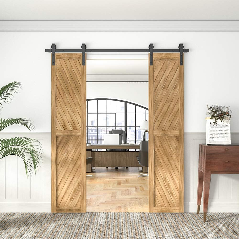Store New Arrivals Add to Favorite View Feedback Contact 6FT Barn Door Hardware Kit: Double Sliding Door Hardware - Black Barn Door Track Kit - Carbon Steel Heavy Duty Door Rail - J-Shape Easy to Install for 36" Closet Panel(No Door) Description Style 6FT /72" 2 Doors Track Kit Pattern Bending Design Thickness 6 Millimeters Batteries Included? No Usage Install Barn Doors Batteries Required? No Finish Black Product Dimensions 73 x 5 x 4 inches Material High Quality Carbon Steel Handle Material Metal Installation Method Wall-Mounted Maximum Weight Capacity 230 Pounds Is Discontinued By Manufacturer No Item Package Quantity 1 Number Of Pieces 27 Item Weight 19.29 pounds Part Number GCM2086-A Mounting Type Wall Mount Color Double Door Kit Shape Bending Design Included Components 5 x lag bolts and spacers, 4 Door stoppers, 2 X 3FT Track, Steel Hangers, Floor Guide, Anti-Jump Pad, other Screw parts Size 6FT Track Kit Sturdy and durty barn door hardware: The side-mounted sliding barn door kit is made of high-quality carbon steel, that can ensure durability and studity to support barn door weight up to 277 lbs. The surface of barn door track is adhered to a fine black powder coating by high temperature to ensure that it can be used for a long time. How to choose the Double barn door hardware kit: The sliding door track length should be at least double the door width. And there should be a minimum of 5.1" gap between the barn door and the ceiling.Fit door panel width: 32", door panel thickness: 1 3/8" - 1 3/4". It can be paired with wood barn door, closet door, MDF barn doors, and more.(If you have thicker door, and longer pipe clamp screws can be supplied) Quiet and smooth sliding door hardware: The high-quality carbon steel track kit ensures barn door slide smoothly. J-Shape barn door rollers can provide smoother rolling. With carbon steel anti-hopping block and stopper for stable movement and long useing. Easy to install: The barn door hardware kit package include:(1) 2 X 3FT Tracks (5) Wall Connectors (4) Rollers (4) Door Stoppers (2) Floor Guide (1) Installation manual; All necessary hardware is included. And we can provide installation video to make you easier when install the barn door kit.This sliding door hardware takes up to 2 people to install in 40 minutes. If you have any issues, please let us know, and we will do our best to assist you.(DOOR NOT INCLUDED) Versatile sliding barn door hardware: The black barn door track provides a sleek, modern look that can complement various interior design styles, from rustic to industrial, including residential homes, offices, and commercial spaces. Barn door hardware kit allow doors to slide parallel to the wall, saving valuable floor space compared to traditional swinging doors. This makes them ideal for smaller rooms or areas with limited space. Product Description 1 Long Lasting 2 Safe & Reliable 3 Track Connector L Floor Guide 2 installation methods allow you groove the door bottom or not. The floor guide can prevent the doors from swing, allow open and close door freely. Safety-ensuring Measures Anti-jump Pad prevent door be lifted off rail. Install them on the top of your door, it can hold the rail once the door hit the stopper. Heavy Duty Track The anti-scratch high temperature fine black powder coated surface and heavy duty 1/4" thick carbon steel rail will last a long time. Strong Load-Bearing Capacity Quality carbon steels is applied for more sturdy. 8.8 grade self-tapping screws and roller screws can hold two 230lbs doors comfortably. Room Dividers Barn door hardware kits can be used in a variety of applications, both practical and decorative. They are great space-saving solutions. Sliding Doors Barn door hardware kits can be used in a variety of applications, both practical and decorative. They are great space-saving solutions. Kitchen Cabinets Barn door hardware kits can be used in a variety of applications, both practical and decorative. They are great space-saving solutions. Interior & Exterior Doors Barn door hardware kits can be used in a variety of applications, both practical and decorative. They are great space-saving solutions. Can I cut the rail to fit my wall? Yes, the rail can be cut to any length. We recommend using an angle grinder to cut the rail. What is the weight capacity? Your door limited 230lbs. What is the compatible door thickness? 1-3/8" ~ 1-3/4". Note: If you have door thickness that falls out of this range, please let us know your exact door thickness so that we can put shorter hex bolts for your thinner doors or longer hex bolts and spacer extenders for your thicker doors. When do I need a headboard? a. If the pre-drilled holes in the rail don't line up with your wall studs. b. If there is a doorway trim. Attach a header board with the same thickness as your doorway trim into your studs first, and then mount the rail onto the header board. How to Choose Product from WINSOON shop? Add to Cart Add to Cart Add to Cart Add to Cart Add to Cart Add to Cart Customer Reviews 4.6 out of 5 stars 641 4.6 out of 5 stars 5,031 4.6 out of 5 stars 2,729 4.4 out of 5 stars 1,602 4.4 out of 5 stars 1,602 4.6 out of 5 stars 5,031 — Price $72.90 $ 72 . 90 $51.98 $ 51 . 98 $108.90 $ 108 . 90 $86.24 $ 86 . 24 $79.99 $ 79 . 99 $51.98 $ 51 . 98 — Used For 2 Doors 1 Door 2 Doors 2 Doors 2 Doors 2 Doors 1 Door Door Overlap / / / 8-10" 8-10" 8-10" / Min Space Needed Above Door 6" 8" 5.1" 5.1" 5.1" 8" 5.1" Door Panel Thickness 1-3/8" ~ 1-3/4" 1-3/8" ~ 1-3/4" 1-3/8" ~ 1-3/4" 1-3/8" ~ 1-3/4" 1-3/8" ~ 1-3/4" 1-3/8" ~ 1-3/4" 1-3/8" ~ 1-3/4" Material high quality carbon steel high quality carbon steel high quality carbon steel high quality carbon steel high quality carbon steel high quality carbon steel high quality carbon steel ABOUT US We offer the best prices around on high quality products. Our E-store includes media such as books, movies, music and games while offering electronics, toys, sporting apparel, clothing, tools, general 