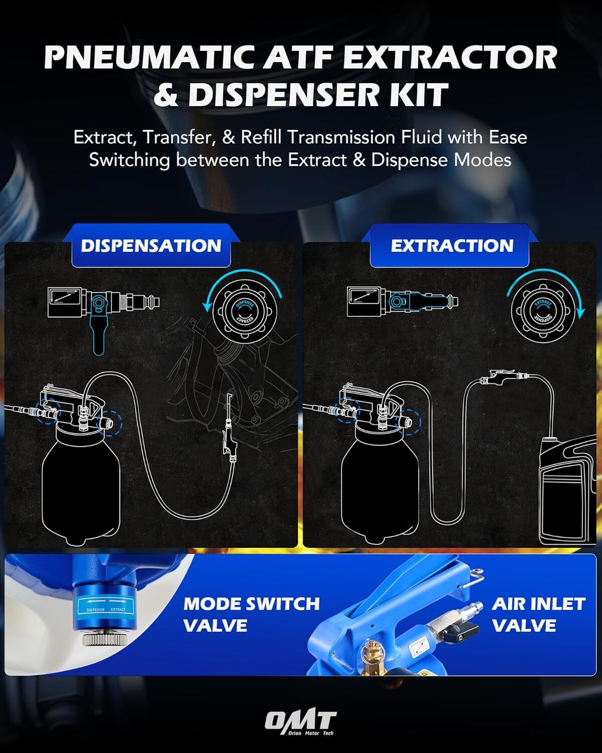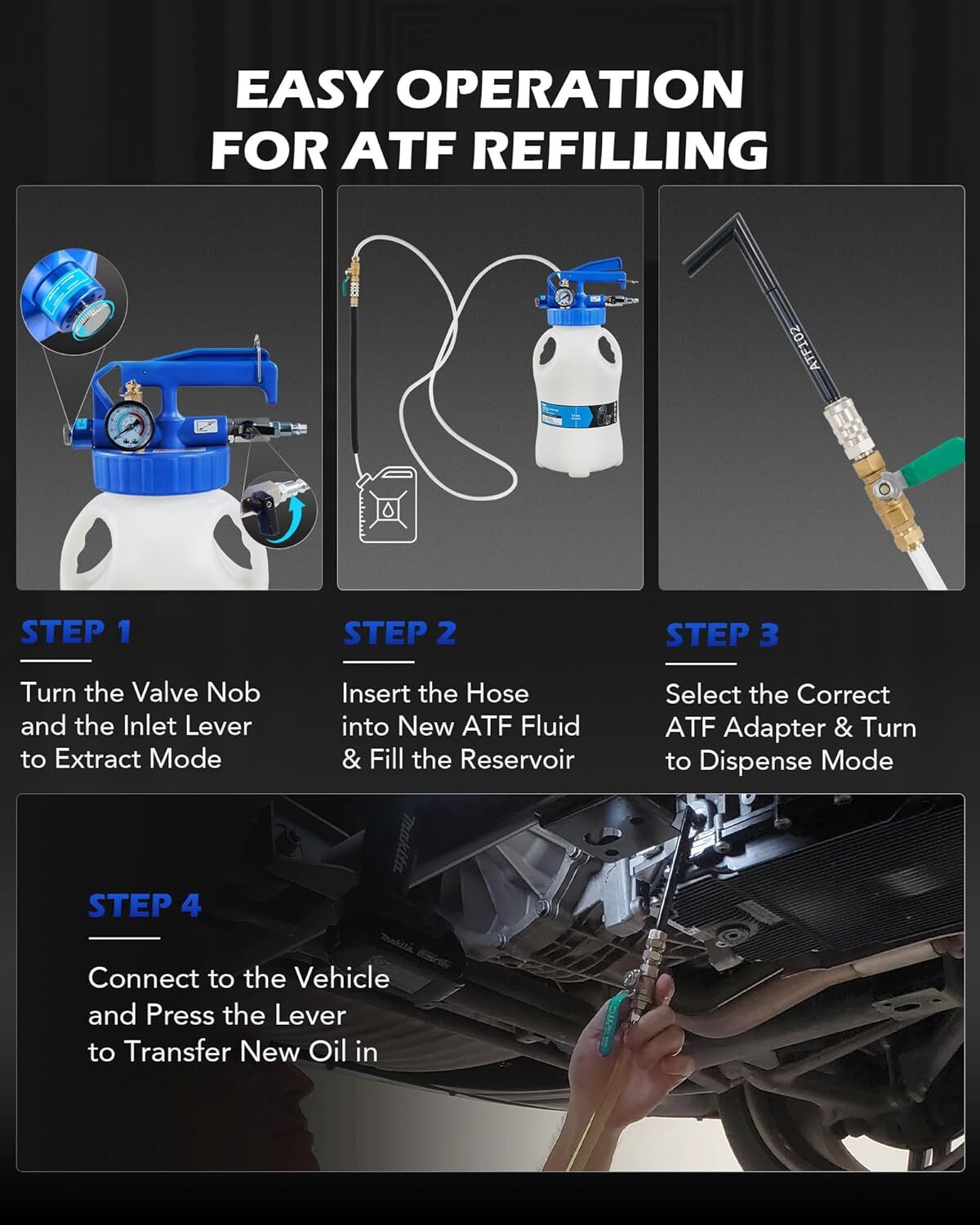 6L EXTRACTOR & DISPENSER: Orion Motor Tech's 1.6 gallon vacuum fluid bleeder set uses compressed air up to 170 psi to extract and 36 psi to dispense producing strong suction with tight seals to let you handle flushes and changes quickly and easily SIMPLE & SAFE OPERATION: The 2 way rotary valve offers immediate changes between extraction and dispensing modes; the trigger lock enables hands-free continuous operation; and the safety valve will pop up automatically in case of overpressure UNIVERSAL COMPATIBILITY: Our pneumatic transmission fluid extractor and dispenser comes with 15 ATF refill adapters for most cars and a tool case for easy storage and transport; the 1/4 NPT air control inlet connects quickly to any standard air compressor Hope-meetuag You can find all you need here Orion Motor Tech Oil Extractor Pump and Dispenser Tool Kit 6L Pneumatic Transmission Fluid Bleeder Set 1.6 gal 2 Way Vacuum Fluid Evacuator and Filler Oil Change Kit 15 ATF Refill Adapters 3 Hoses 6L EXTRACTOR & DISPENSER: Orion Motor Tech's 1.6 gallon vacuum fluid bleeder set uses compressed air up to 170 psi to extract and 36 psi to dispense producing strong suction with tight seals to let you handle flushes and changes quickly and easily SIMPLE & SAFE OPERATION: The 2 way rotary valve offers immediate changes between extraction and dispensing modes; the trigger lock enables hands-free continuous operation; and the safety valve will pop up automatically in case of overpressure UNIVERSAL COMPATIBILITY: Our pneumatic transmission fluid extractor and dispenser comes with 15 ATF refill adapters for most cars and a tool case for easy storage and transport; the 1/4 NPT air control inlet connects quickly to any standard air compressor USER-FRIENDLY DESIGN: The transparent hoses let you monitor progress and inspect fluid quality; the built-in pressure gauge offers real-time readings; the hangers keep tools organized and nitrile-coated gloves protect your hands from corrosive oils QUALITY CONSTRUCTION: Three rigid polyurethane and nylon hoses polyethylene reservoir and 6061 aluminum alloy adapters are all highly resistant to heat and chemical corrosion to easily handle even the grimiest old fluids year after year Begin by turning both valve knob on the reservoir lid and air inlet lever to Extract and by confirming that the trigger is off. Connect the pump to an air compressor lock the trigger insert the hose into new ATF fluid then press the trigger to fill the tank. Select the ATF adapter compatible with your vehicle connect it to the hose and switch the valves to Dispense. Connect the adapter to the inlet lock the trigger and open the hose valve to add fresh fluid to your transmission. --- Add to Cart --- Add to Cart --- Add to Cart --- Add to Cart --- Add to Cart Add to CartCustomer Reviews 4.1 out of 5 stars734.4 out of 5 stars904.1 out of 5 stars1044.1 out of 5 stars123.9 out of 5 stars994.2 out of 5 stars479 Price $79.99$79.99$59.99$59.99$99.99$99.99$79.99$79.99$19.99$19.99$49.99$49.99 Application Oil Extraction & FillingOil FillingOil FillingOil Extraction & FillingBrake BleedingBrake Bleeding Pump Type PneumaticManualManualPneumaticPneumaticManual Tank Capacity 1.6 gal. (6 L)0.8 gal. (3 L)2 gal. (7.5 L)2.6 gal. (10 L)0.2 gal. (0.75 L)0.7 gal. (2.5L) Extraction Pressure 40–170 psi//40–170 psi90–120 psi/ Max. Dispense Volume //2.7 fl. oz./Cycle/// Hose Number 311311 Hose Length 28.7 39.4 & 59 in. 42.5 in.47.2 in.28.7 39.4 & 59 in. 5 in.3.3 in. ATF Adapter Number 1512151581 Operating Temp. Range 41–113°F (5–45°C)41–113°F (5–45°C)41–113°F (5–45°C)41–113°F (5–45°C)// AccessoriesHooks GlovesCap Wrench Adapter BandWrench Screwdriver Gloves Hooks GlovesHose ConnectorCap Wrench 15 x Adapters 3 x Tubes 2 x Hooks 1 x Pair of Protective Gloves Easy Operation Step 1 Step 2 Step 3 Step 4 Orion Motor Tech Oil Pump Item Specifics Brand Unbranded Type Fluid Evacuators Volume 8.9 x 6.7 x 17.9 inches Weight 7.26 pounds Payment If you do not have a PayPal account, to get started and buy your first item with us is very easy. Simply click on the 'Buy It Now' button and follow the eBay checkout steps. Select PayPal as the payment method you then will be given the chance to enter your card details in to PayPal's secure checkout in order to pay for your order. Shipping 1. Your purchase is shipped directly to you as soon as we have received your cleared payment. 2. Normally all of parcels would be shipped within 3days(From Monday to Saturday). 3. We will send information on eBay or email if the parcel was delayed due to our holiday. 4. We provide three kinds of shipping for choice. Shipping way depend on delivery address. Returns If an unit is received defective, of course we take it back or replace it. If the unit is received as expected, we must charge for our expenses if you want to send it back. We have to charge for the work of handling, retesting and restocking. Contact Us Dear buyer, Thank you for visiting my store! Our warehouses are located in many regions around the United States. According to the customer's delivery address. Use USPS/UPS/DHL logistics transportation service. Prioritize the best quality logistics solutions to transport packages. Ensure package delivery time, At the same time. Have any after-sales problems, Feel free to contact us. At your service Hope-meetuag You can find all you need here DESCRIPTION PAYMENT SHIPPING RETURN POLICY CONTACT US Shop Category Store Home Other Hot Item US Rear Pair (2) Shock Absorber 06-2010 Hyundai Sonata 2006-2011 Azera USD 49.37 US Ignition Coil 2001-2010 Toyota Yaris Prius xA xB Echo 1.5L 90919-02240 USD 21.94 US Vapor Canister Purge Valve Solenoid compatible Volkswagen VW EOS Golf Jetta P USD 17.01 US Rear Left Right ABS Wheel Speed Sensor,for Toyota RAV-4 2000-2005 89545-42030 USD 23.35 US 2X Rear Struts Assembly / Shocks 2003 2004 2005 2006 2007 2008 Honda Pilot USD 47.28 Picture New List Item US Milwaukee 2446-21XC M12 Cordless Lithium-Ion Gre