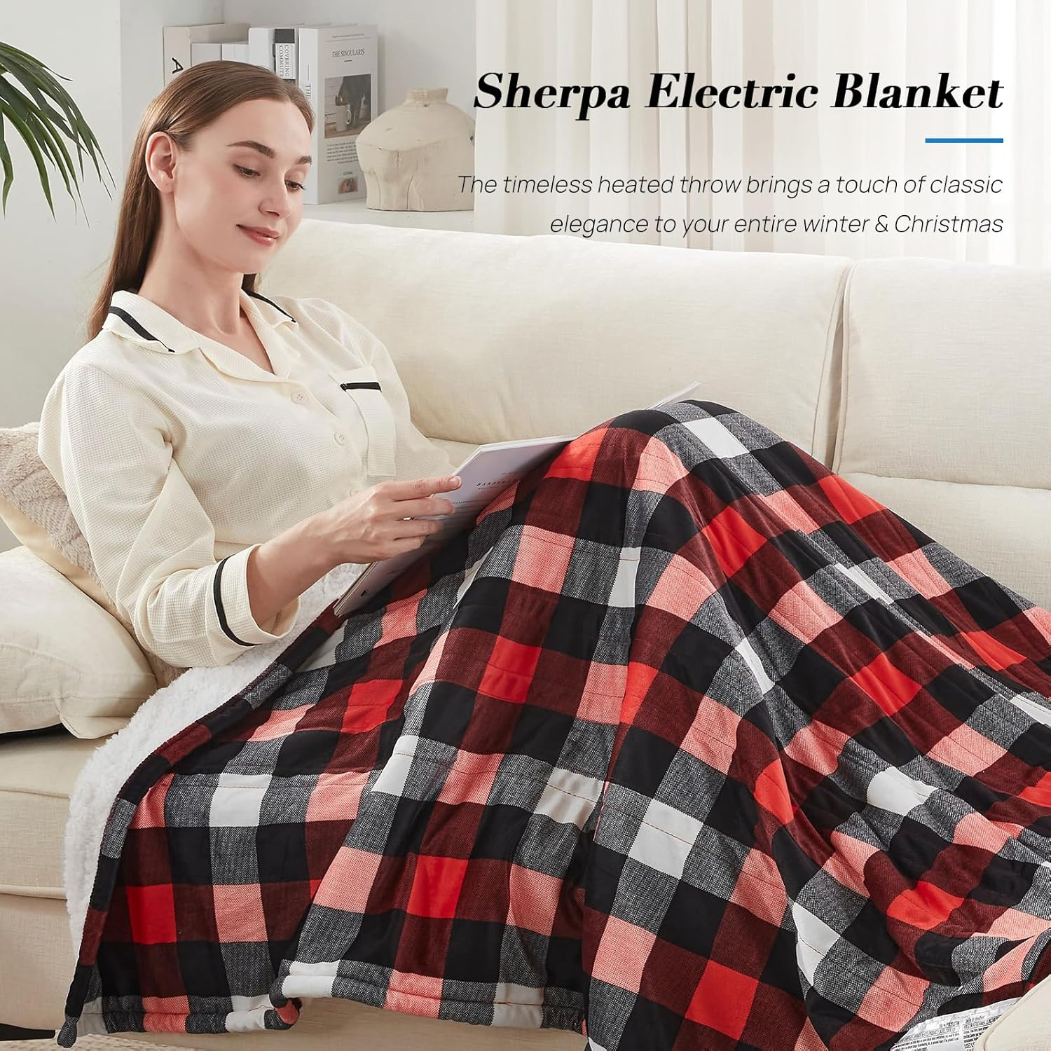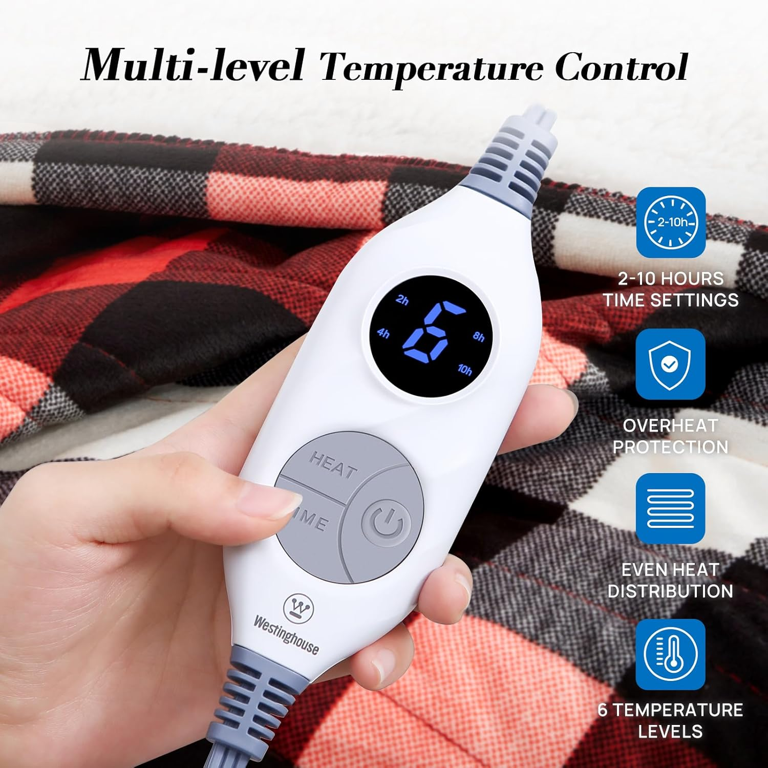 【ETL and FCC Certified】 Our heated blanket have 6 Heating levels for different people needs. 2-10 Hours time setting, overheat protection ensure your safety during normal use. Please read the instructions carefully before use heated blanket to avoid local overheating caused by improper use 【Soft Cozy Material 】 The side with 200GSM printed red plaid microfiber and the other side with 200GSM white Sherpa. The heating blanket is suitable for use during work, on couch or sofa while watching television, reading books, relaxing and bring you a warm and comfortable life experience 【Fast & Memory Heating Design 】 This Heated throw blanket is programmed with a pre-heat procedure for quick heat distribution when you turn on it , and revert automatically to the last comfort level setting used. Promotes blood circulation for therapeutic heat relief, warm and relax your body to relieve fatigue. Combat the shivers with electric throw blanket of warmth and comfort 【Machine Washable】 The electric blanket is very convenient to clean and care. Just unplug the controller and toss it into the washing machine. We also made it dryer safe for more easy and convenient cleaning 【Excellent After Sales】 If you have any issue, we're always here to help you. Westinghouse enables to continually make improvement of products based on suggestion, making lives easier and more enjoyable Product Description 1 CONTROLLER FEATURES 2 COMPACT DESIGN 3 PREMIUM FABRIC
