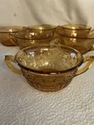 These six each vintage Indiana Glass Daisy amber cream soup bowls, complete with dual handles for easy serving, and matching bread and butter plates, are perfect for adding a warm, nostalgic touch to your table setting. Total of 12 pieces. The pattern was produced by Indiana Glass in amber between 1940 and 1970. The cream dual handle soup bowls are quite RARE and messure 6” from handle to handle and 2.5” tall. The bread and butter plates are also 6” round. With their iconic floral pattern, these pieces not only serve as functional dishware but also as timeless collectables. What a fabulous gift this spring or summer!