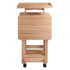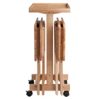 Perfect for entertaining or relaxing on the patio or in front of the TV, this set of Solid Wood Snack Tables comes with an upright stand that stores the folded tables securely and discretely when not in use. A removable wood serving tray that sits atop the stand provides extra table top space when needed. The stand rolls easily on casters, two of which lock to keep the unit stable. And with each of the 4 tables opening to a generous 19"W x 14.5"D, there is plenty of room for a meal, snacks and drinks. Made of Solid Wood in a Natural finish. Sold as 1 Each. 4 Solid Wood Folding Tables. Made of Solid Wood. Upright storage stand. Stand dimensions: 12"W x 15.9"D x 35"H. Removable Serving Tray 19.7"W x 14.9"D. Tables come fully assembled. Stand rolls on casters, two of which are locking. Parts replacement within 30 days.