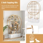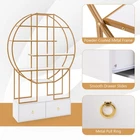 6-Tier Golden Geometric Bookshelf 71" Living Room Bookcase With 2 Storage Drawer ● Luxury Geometric Bookshelf: Blending with round silhouette and staggered shelves, this bookshelf exudes a high-end and elegant feel. The combination of gold lacquered metal frame and whiteboard adds sophisticated flair to your home. ● Ample Storage and Display Space: Various open staggered shelves and 2 drawers provide the convenience of ample storage space and easy access to your books, collections, photos and potted plants. Besides, vertical structure makes full use space while keeping room in order. ● Heavy Duty Metal Structure: Made of powder-coated metal frame, the modern standing bookcase presents great sturdiness and durability, which is a reliable addition to your living space. The protective pads at the bottom are provided to avoid scratches. ● Secured by Anti-Toppling Kits: For reliable structure, the anti-topping kits on the back can be attached to the wall, thus preventing the bookcase from falling accidentally. The display shelf is more stable than other shelves and brings full sense of security for family use. ● Multipurpose Design: The round open bookshelf wisely marries form, style and function, making it ideal for living room, bedroom, study and office. More than an etagere bookcase, you can use it as a display shelf, storage rack or plant stand. Color: White & Gold Material: MDF, Metal, Zinc Alloy Product Dimensions: 48" x 12" x 71" Interior Dimensions of Drawer: 17" x 9.5" x 7" Net Weight: 71.5 lbs Weight Capacity of Staggered Shelf: 33 lbs Weight Capacity of Bottom Shelf: 88 lbs Weight Capacity of Each Drawer: 22 lbs