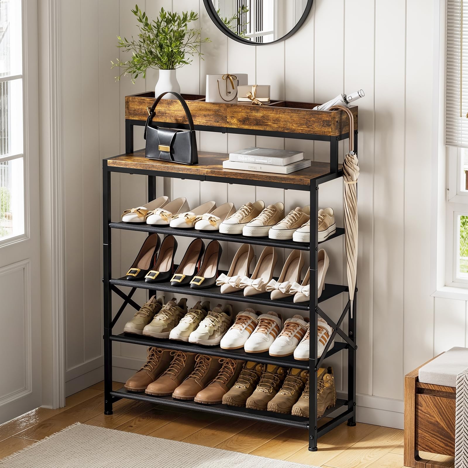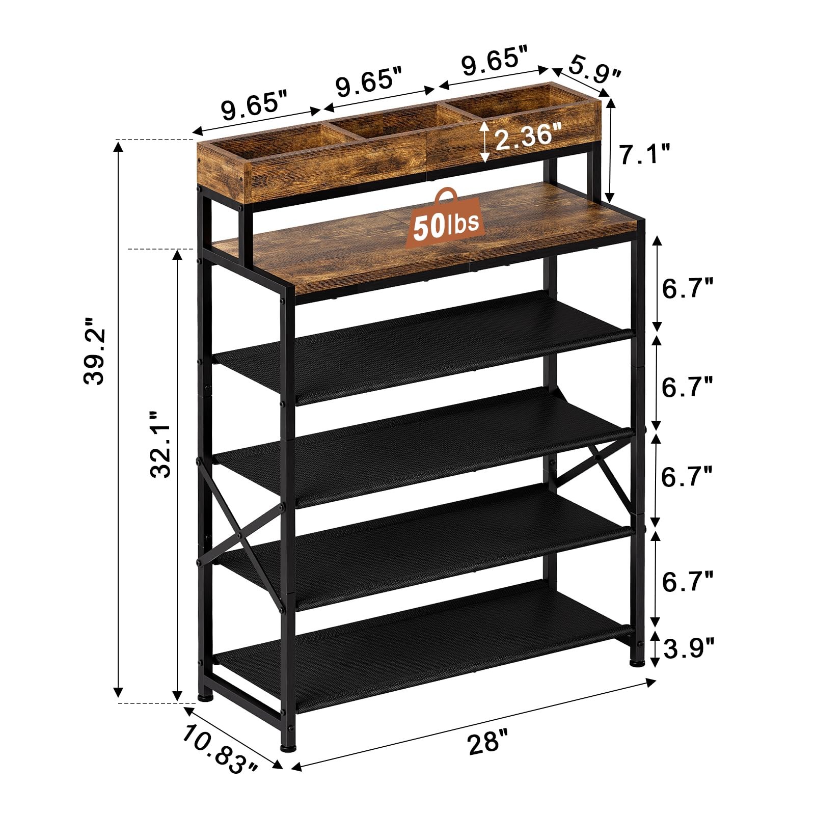 Shoe Rack, 6 Tier Shoe Storage Organizer with Compartment, 4 Oxford Fabric Shelves and Top Panel, Steel Frame, Holds 16-20 Pairs of Shoes, for Entryway and Closet, Industrial Small Footprint, Large Storage: The shoe rack takes up little floor space, making it an ideal storage solution for any narrow or tiny space. This wooden shoe rack is 28.0"W x 10.8"D x 39.2"H. Metal shoe rack can hold up to 22 pairs of shoes, It is often suitable for narrow entrances, closets, living rooms, bedrooms, apartments, and dormitorie Sturdy Metal Shoe Rack: Compared with other entrance shoe racks, our industrial shoes rack storage organizer is made of metal grid frame and wooden board, which is more sturdy and durable. Therefore, no matter what condition our rustic shoe rack is in, you don't have to worry about its bearing problem. The P2 grade high-quality particle board countertop and Oxford cloth Shelves are waterproof and moisture-proof, making the shoe rack easy to clean. The shoe shelf is equipped with an anti-tip kit that can be fixed to the wall for added safety Thoughtful in Details Shoe Rack Closet: The wooden top of the shoe rack provides an ideal place for your glass vases and ceramic artworks. There are 3 separate large storage compartments, allowing you to items such as slippers, wallets, shoe covers, umbrellas, sock bags and more. The enclosed edges on all sides can prevent them from falling Meticulously Design: The shelf distance is 6.7”, if you prefer a larger space, you can remove a shelf to place the boots. The unique adjustable foot design provides 3cm adjustable space at the bottom of the wooden shoe rack, allowing it to maintain balance on uneven surfaces Easy to assemble: With detailed instructions and clearly marked parts, you can easily complete the assembly of the shoe rack in just 15 minutes and start your task of organizing shoes