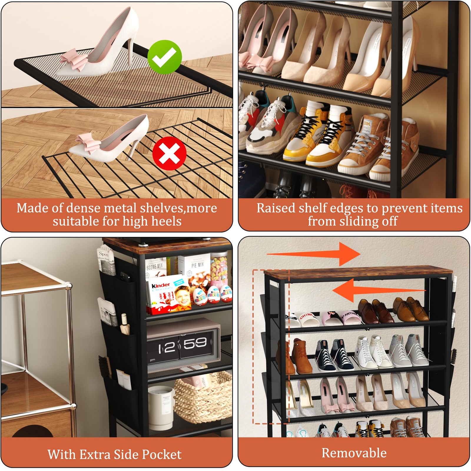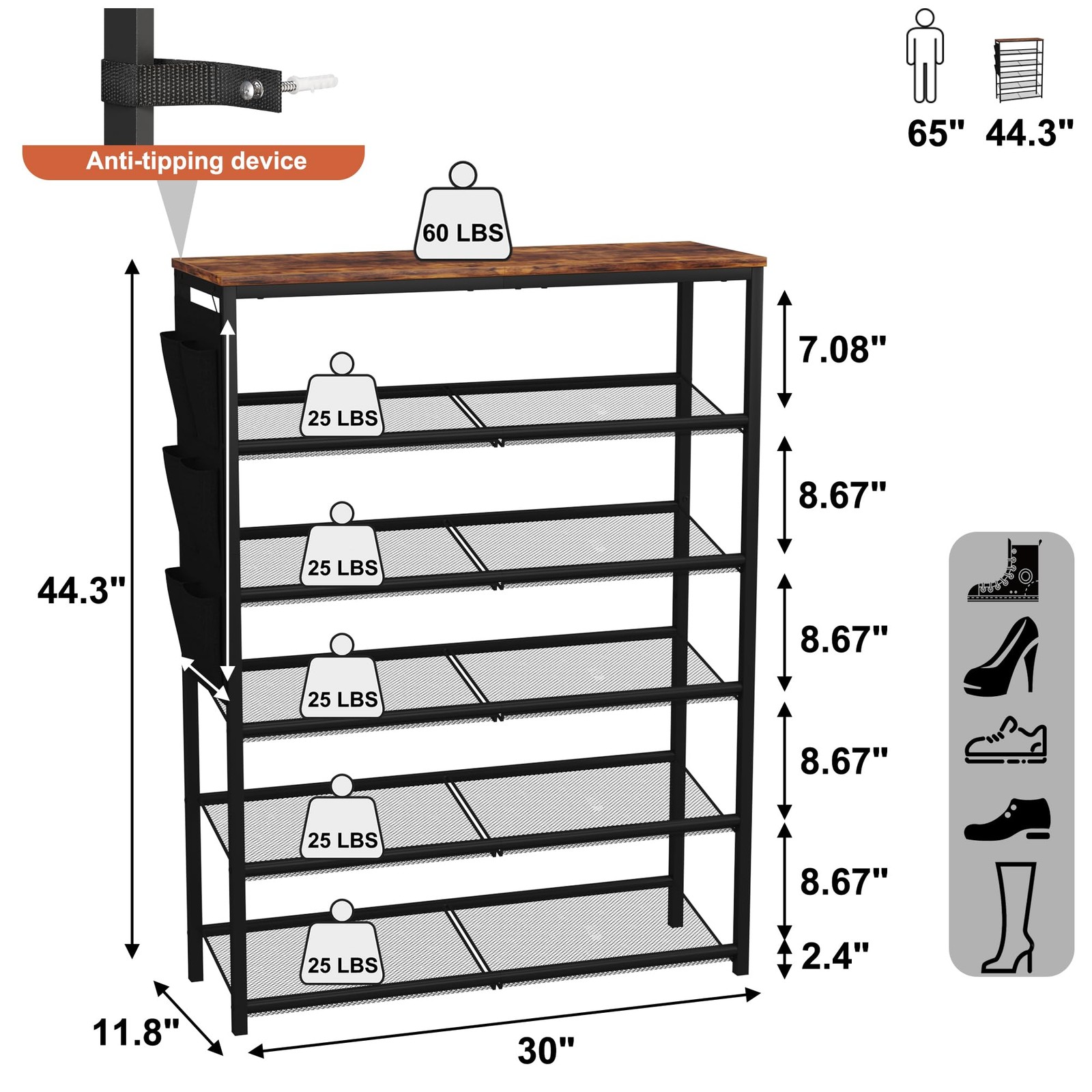 freestanding shoe rack shoe storage shelf for closet entryway front door entrance 【18-24 Pairs of Shoes】With each tier capable of holding 4-5 pairs,this 6-tier shoe rack can hold up to 24 pairs of shoes.Its compact design allows for placement in a small entryway, foyer, hallway, or closet.It's ideal for maintaining a tidy and organized front door entrance. 【30" Industrial Shoe Rack Organizer with Large Tabletop】The flat and spacious tabletop enhances the versatility and appeal of this shoe organizer. You can use it to place a mail basket, purse, backpack, or hand sanitizer. The distance between each mesh shelf is 7.87-8.67 inches, allowing for the storage of various types of footwear including high tops and heels. This organizer is suitable for a wide range of shoes, from high heels to sneakers, and the mesh shelf can be removed to fit tall boots. 【Solid Material and Stable Construction】Constructed with mesh shelves and high-quality engineered wood, the tabletop of this shoe shelf can hold 60 lbs, while each tier of mesh shelf can bear 25 lbs. The anti-tipping device for wall mounting ensures the safety and stability of this shoe rack. The melding of wood and metal is suitable for both modern and traditional decor, offering a stable structure built to endure daily use over the years. 【Space Saving Shoe Storage with Adjustable Mesh Shelves】The narrow dimension of 30" Wx11.8"Dx44.3" H allows for discreet shoe storage without encroaching on entryways or closets. Each mesh shelf is adjustable, offering the flexibility to be placed flat or angled according to various storage needs. The extra side pocket provides convenient storage for keys, socks, hats, and other daily essentials. 【Assembly and After-sale Service】With clearly labeled assembly parts and well-illustrated instructions, this shoe storage cabinet is quick to assemble. Our 100% customer satisfaction policy allows you to exchange or refund without any cost if the product does not meet your demand.