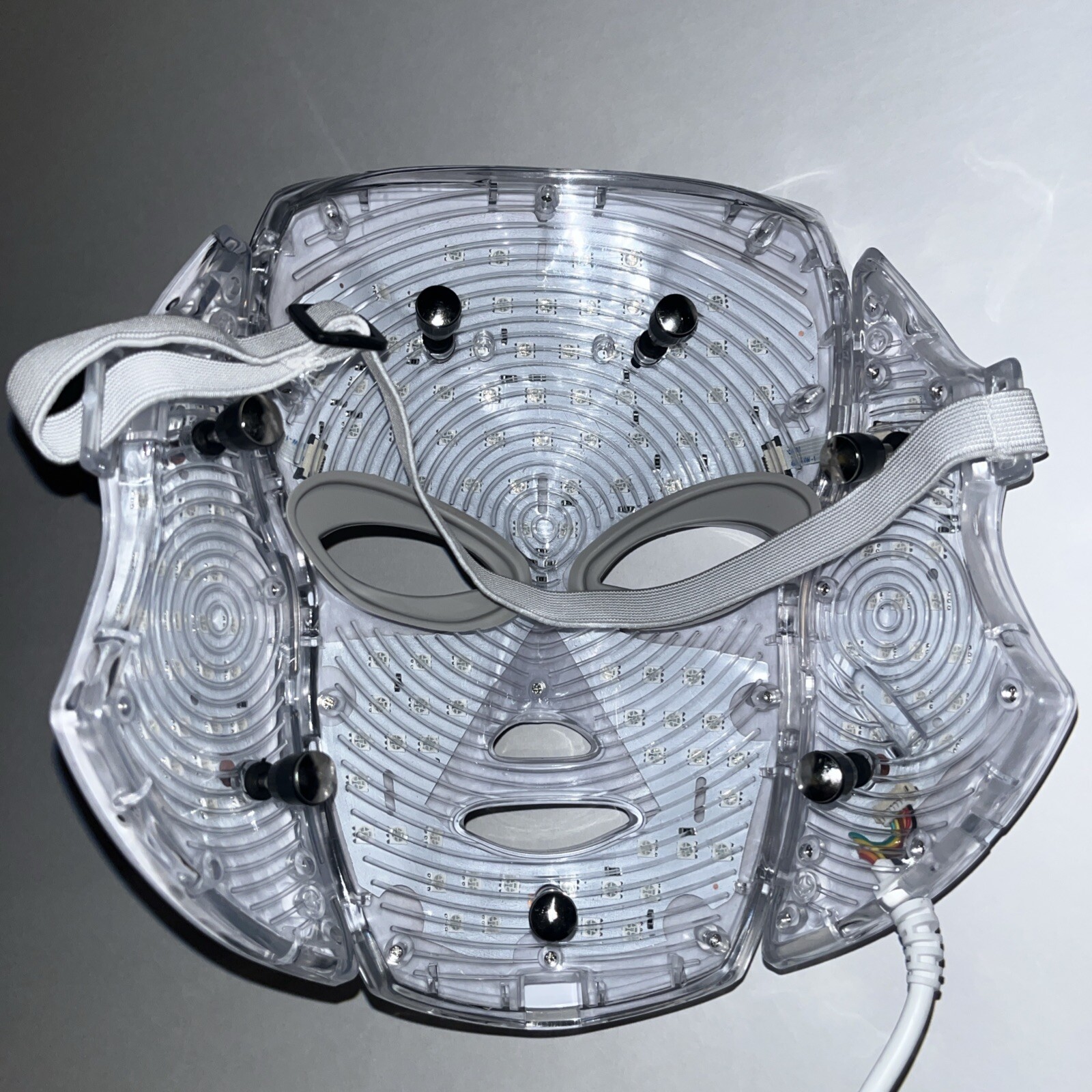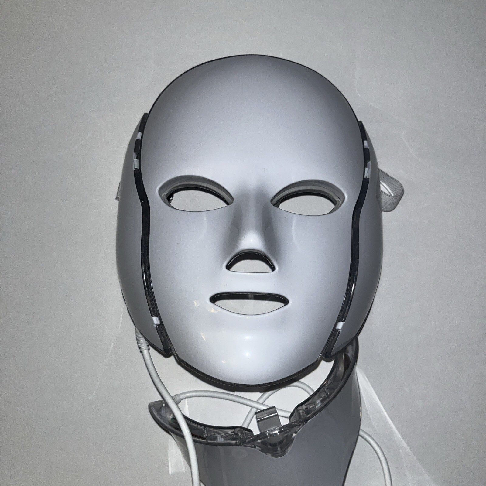 LED acne, anti-aging, skin clearing mask. Opened it and never got around to using it. This LED Light Photon Face Neck Mask offers 7 colors for rejuvenation, targeting early signs of aging, hydration, acne, and more. Suitable for all skin types, it helps improve skin brightness, tighten and firm the skin, and promote absorption. The set includes LED Light Therapy for at-home or salon use, with an operating voltage of 110V-220V. Perfect as a Christmas gift for women.
