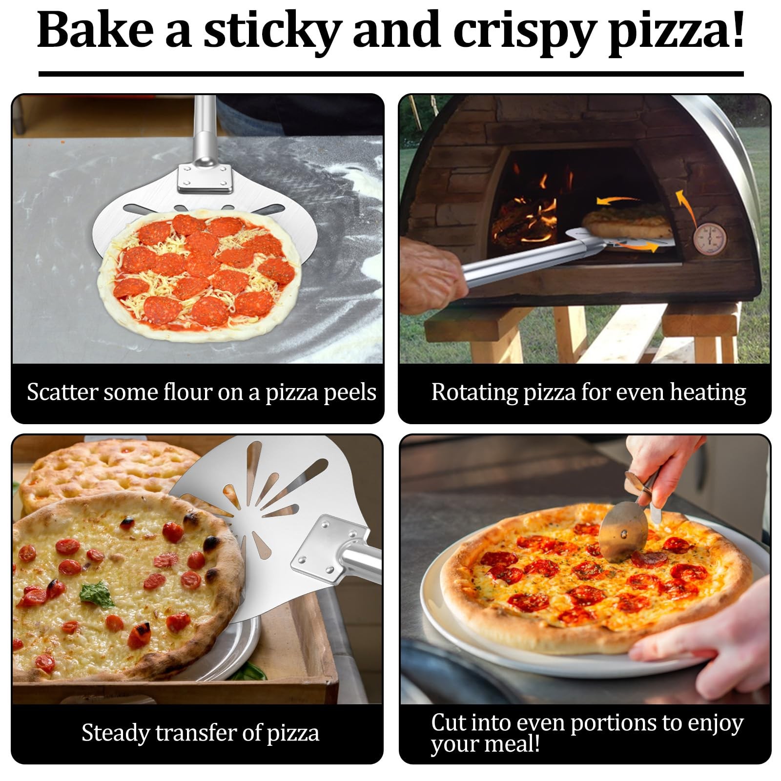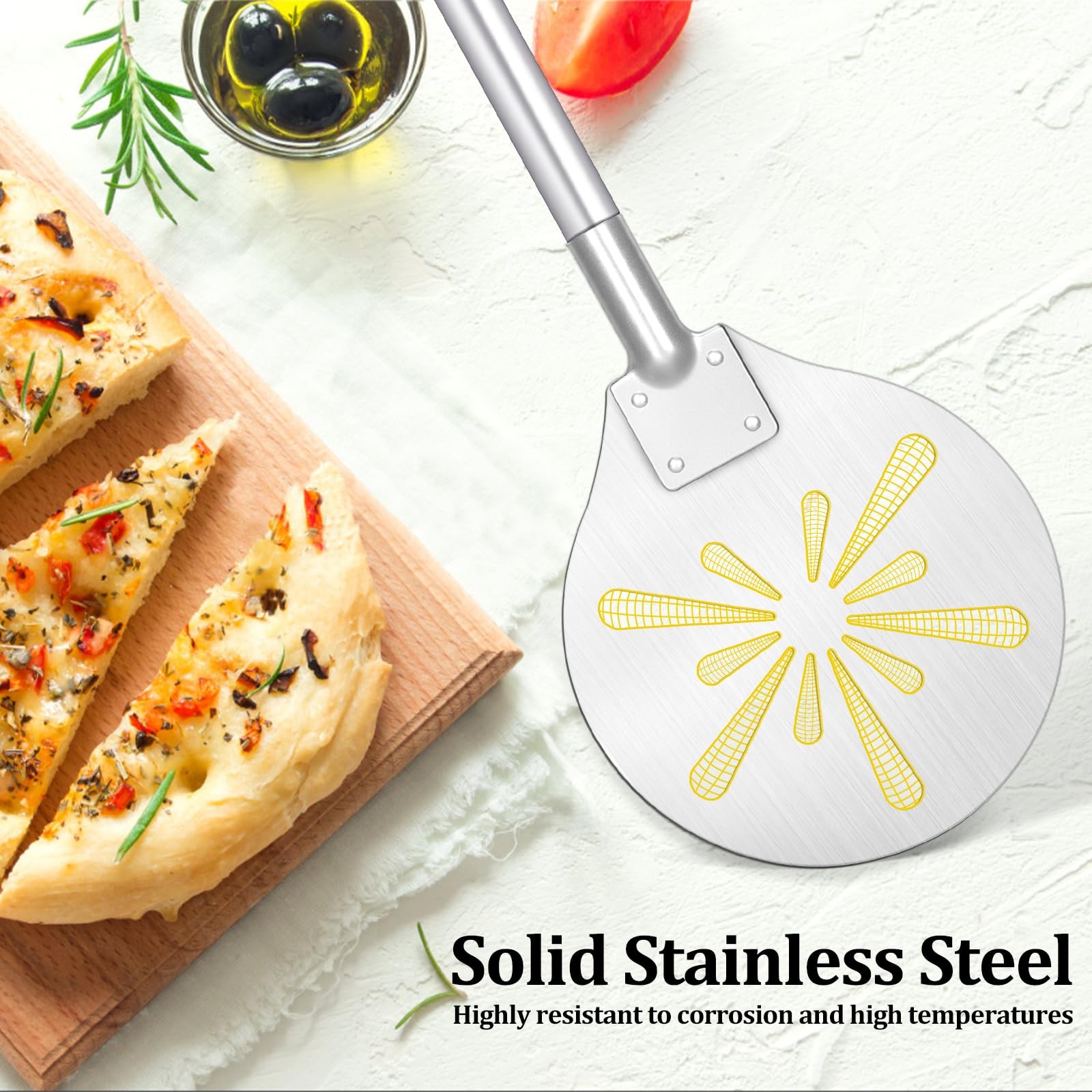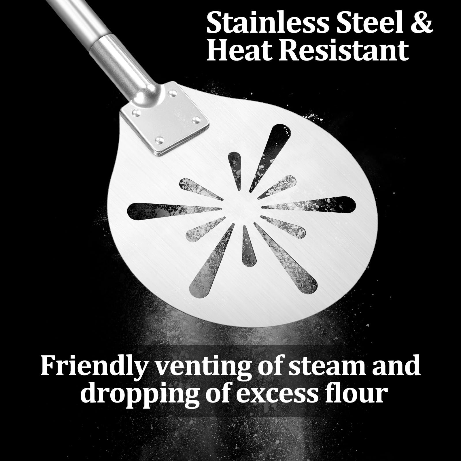 Leonyo 7 Inch Pizza Peel Our pizza peels are compact and short, which made it easy to turn around the pizza in the confined space of the oven. The teardrop-shape hole on the pizza spatula are designed to allow excess floor to fall off the bottom of the pizza, thus reducing burnt and bitter flavors. Comes in a gift box for you to present to your friends and family and is perfectly suited for commercial restaurants, home and outdoor ovens. Specification Color: Silver Dimension: 7 inch Material: All Stainless Steel Fits All Ovens, compact size of the pizza peel makes it easy to get in at one angle and out at another, allows you to smoothly turn pizzas in tight spaces like a professional chef, its strong support ensures that topping-rich pizzas do not risk sagging, your homemade pizza-making process will run smoother for perfect results Perforated Pizza Peel, the stylish teardrop design in the round pizza paddle is practical for shaking off excess flour from the pizza, and reduces bottom burn and bitterness, while increasing circulation for a crispier crust, making Margherita pizza, Sicilian pizzas, cakes and pies Lightweight & Insulated, pizza spatula is not heavy and easy to operate with one hand, the 18.4-inch handle is long enough to keep you away from the boiling hot oven to prevent burns, and comes with a hanging rope to hang on the wall to make storage a breeze High Heat Resistance, 7 inch pizza paddle made of food-grade 304 stainless steel, which is rust and corrosion resistant, rivets hold the pizza spatula securely in place, providing you with a reliable and long-lasting use experience Ideal Gift for Baking Enthusiasts, our pizza turning peels are maintenance free and will keep their original look, comes in a gift box for you to present to your friends and family and is perfectly suited for commercial restaurants, home and outdoor ovens