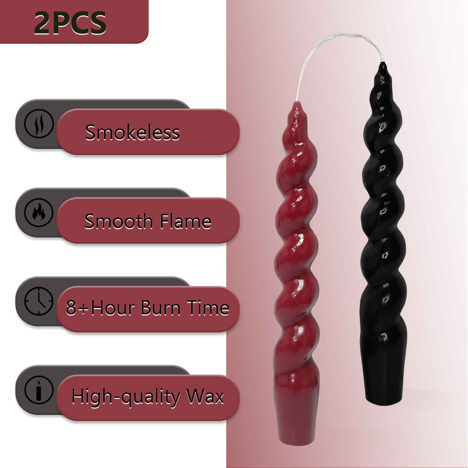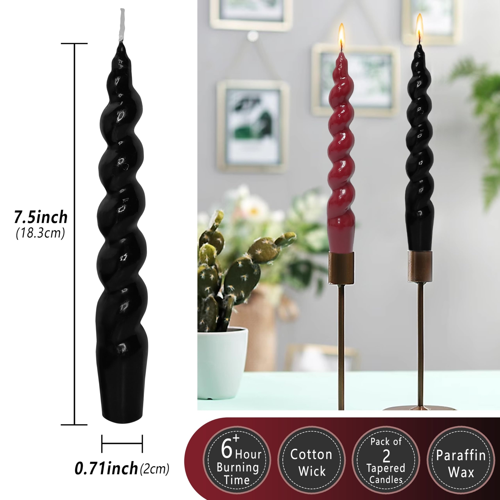 Taper Candles Spiral Candlesticks - 7 Inch Short Tapered Candle Twisted Candlesticks Smokeless Candle Stick for Holiday Wedding Party Dinner Table Decoration, Red & Blcak SMOKELESS & ODORLESS CANDLE - Immerse yourself in tranquility with our twisted candlestick. This unique creation not only boasts a mesmerizing spiral design but also ensures a clean burn, free from smoke or unwanted fragrances. Revel in the serene glow of this distinctive twirl candle. LONG-LASTING BURNING CANDLE - Transform your ambiance with our unscented candles. Crafted for extended burn times, this candle stick promises enduring warmth, making it the suitable companion for long, cozy evenings. Watch as the spiral design unfolds hours of delightful illumination. THOUGHTFUL CANDLE GIFT - Unveil the joy of gifting with our spiral candlesticks. Whether it's a celebration or a token of appreciation, this pastel candlesticks is a flawless and timeless present, seamlessly blending aesthetics and functionality. HANDMADE CANDLESTICK - Adorn your spaces with the versatility of our holiday candles. Designed to suit any scene, from intimate gatherings to sophisticated events, its unique spiral form adds an artistic touch to your decor, creating an ambiance that resonates with elegance. UNIQUE TAPER CANDLE - Introducing our decoration candles, a symbol of distinctive illumination. The captivating spiral design not only enhances visual appeal but also ensures a dynamic play of light, creating a mesmerizing atmosphere. Illuminate your surroundings with the extraordinary charm of this dinner candle. The spiral taper candle is an exquisite and captivating piece of artistry. Its slender form gracefully winds upward, reminiscent of a delicate helix, creating a mesmerizing visual spectacle. Crafted with precision, the candle curves and twists in suitable harmony, casting an enchanting glow as the flame dances along the sinuous path. The spiral design not only adds an aesthetic flair but also serves a functional purpose, ensuring a slow and even burn. As the candlelight flickers and plays upon the intricate twists, it transforms any space into a serene and enchanting ambiance, making the spiral candle a unique and delightful addition to any setting. SHIPPING Domestic Buyers - We have confidence in our products, but if you are not fully satisfied please contact us within 30 days of purchase and you will get full refund. - We ship within 3 business days of payment, usually sooner - We offer FREE shipping on all orders! - We only ship to the lower 48 states, no APO/FPO addresses or PO Boxes allowed International buyers – please note: Import duties, taxes, and charges aren't included in the item price or postage cost. These charges are the buyer's responsibility. - Please check with your country's customs office to determine what these additional costs will be prior to bidding or buying. * Order Cancellation Policy ** You can return a product for up to 30 days from the date you purchased it. 1. The seller reserves the right to cancel the special case only due to eBay cancellation fee. 2. The decision of seller is the final. 3. The seller will respond to the cancellation request within 2 business days. Please wait for the result of cancellation. 4. In case the cancellation is not completed by some reasons, the buyer can follow the options below to get the refund. 4.1 The buyer can reject the item when it arrives. 4.2 The buyer can send the item back to the seller within 30 days If the buyer receives item (USA Shipment ONLY). The seller will provide the FREE return label to the buyer when the buyer opens " Return Item" case on eBay by using the reason as "Change my mind" ONLY. 5. When buyer has placed the order. The order will be processed and completed by automatic warehouse system within 5 minutes. In case that buyer sends the cancellation request after 5 minutes of placing the order, the request will be rejected. **Sending direct message to cancel the order is not allowed for every case.* Return Policy For the return case - If buyer would like to return the items for refund or replacement, please CONTACT SELLER to receive the free return label from seller. The refund or replacement will be processed with the tracking number of return label which is provided by seller only. The other ways of return which are not approved by seller will not be processed for the refund or replacement.