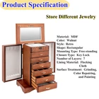7 Layers Wooden Jewelry Ring Display Organizer Case Large Earring Storage Box US Description Every girl has some beautiful jewelry, which can provide us with a better mental outlook. But how to store it often makes us feel distressed. Our seven-layer jewelry box can help you solve this problem. It is made of MDF. The jewelry box is sturdy and durable, ensuring that you can use it for a long time. Large capacity and reasonable layout can help you store all kinds of jewelry in boxes and create a clean environment for you. It will be a good assistant in your daily life. Specifications Material: MDF Lining Material: Flocking Cloth Surface Treatment: Grinding, Color Repairing, and Painting Color: Walnut Style: Retro Shape: Rectangular Mounting Type: Free-standing Closure Type: Key Lock Number of Layers: 7 Net Weight: 6kg/13.23lbs Gross Weight: 6.5kg/14.33lbs Product Size: 28.3*17.6*36cm/11.1*6.9*14.2inch Package Size: 34.5*26*43cm/13.58*10.24*16.93inch Package Included 1* Jewelry Box 1* Key Key Features Premium Material: The jewelry box is made of MDF and flocking cloth, which is durable and not easy to deform. The flocking cloth can better protect your jewelry from scratches. Exquisite Workmanship: The jewelry box adopts grinding, color repairing, and painting to make the surface of the product smoother and brighter, which shows our attitude toward beauty and life. Large Capacity: The jewelry box is equipped with seven layers in total. Such a large capacity allows you to store many items, such as necklaces, watches, etc. at one time, saving desktop space and fully meeting your needs. Reasonable Layout : According to different sizes and types of jewelry, this jewelry box is designed with compartments of different sizes, as well as special necklace hangers, ring rolls, etc., so that you can store, take and display your jewelry better. Beautiful Appearance: The jewelry box is walnut in color, demonstrating antiquity and nobility. With smooth lines, the whole jewelry box is full of fashion and elegance. It can also make your room more attractive. Customer-friendly Design: The intimate cover with a mirror provides waterproof and dustproof performance to better protect your jewelry while facilitating your makeup. Ready to Use : The jewelry box does not need to be assembled. You can use it directly after receiving the goods, saving you time. Easy to Clean: The surface of the jewelry box is smooth, so you don't need to spend much effort to clean it. When dust accumulates, you can clean it with a wet towel. Small Floor Space: The overall size of the jewelry box is 11.1 * 6.9 inches, which will not occupy too much space, so you can put it in the bedroom, dresser, and other places at will. Ideal Gift: With a beautiful appearance, unique design, and enough space, you can give it to your mother, lover, or friend, or regard it as a gift for Valentine’s Day, Christmas, and birthdays. Protective Packaging: Both foam and bubble bag are used in the package of the jewelry box, which can protect the product well during transportation so that it can be delivered to you completely. Details Key: A key is provided in the package of the product, and the top of the product is equipped with a lock catch, which is convenient for you to access jewelry and prevent the loss of items. Beautiful Handle: Each drawer of the jewelry box is equipped with a handle with a metallic luster, which is beautiful and convenient for you to take jewelry. Hook: The compartments on both sides of the jewelry box for storing necklaces are respectively equipped with four hooks, which are solid and firm. You can better place and store necklaces and avoid knotting necklaces. Base: The base of the jewelry box is very firm, which can make the jewelry box more stable and not easy to shake. Round Corners: The edges of the jewelry box are very round, which can prevent your hands from being scratched, so as to better protect your safety. Application The product can be widely used to store watches, necklaces, earrings, rings, and other items, and can be placed in the living room, bedroom, dressing table, and so on. Notes Please pull the drawer carefully when using it, and do not use force to destroy the handicraft. Please keep this product away from water sources. Please allow the slight color difference caused by the shooting light and 1-3cm error due to manual measurement, and make sure you do not mind before you order. Payment Delivery details Terms of sales About us Contact us Payment We accept ebay payment 。 Fees such as import duties, taxes are not included in the item price or shipping costs. These charges are the buyer's responsibility. Delivery details Shipping: 2-9 working days to: USA Terms of sales We maintain high standards of excellence and strive for hundred percent customer satisfaction. Feedback is very important to us. We hope that you contact us immediately before you give neutral or negative feedback, so that we can address your concerns. It is impossible to address issues if we do not know about them! About us Your satis faction is our ultimate goal. We work hard to earn your trust and future business. Our certified technicians have tested each item before shipping. The unit comes with 1 year limited warranty on all manufacturing defects. a) If you receive a defective item, you may return it or ask for a discount. Please contact us within 14 days after you receive the package. b) What you returned must be intact and in its original packaging as re? u. Customer is responsible for shipping costs of the returned item. c) We will cover the cost of shipping back t with the shipping rate indicated in the registration page. We will send you a new unit or refund the full payment you paid. Thank you. Contact us Business Hour Business Hour: Monday To Friday: 8:30 AM to 5:00 PM (Beijing China time) Due to time zones, our reply to your questions may not be immediately. But within above working time, we will reply your email within 24 hour