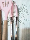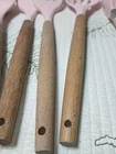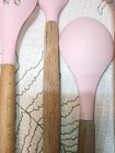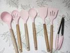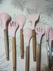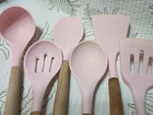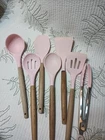 Crafted for the modern kitchen, this 7-piece silicone utensil set combines functionality with a pop of color. Each tool is designed with a sturdy wooden handle, providing a comfortable grip that's both durable and classic in design. The silicone construction ensures ease of use and cleanup, perfect for busy chefs who value convenience without compromising on quality.The set includes a variety of pieces to meet all your cooking needs, from serving pasta with the tongs to scooping up batter with the spatula. The pink hue adds a fun, feminine touch to your kitchen ensemble, while the material's high heat resistance makes it ideal for all your cooking adventures, whether you're stirring a pot or crafting the perfect omelette.see my pics for condition of the wood ,they weren't used , have been sitting in my kitchen , great cooking product...