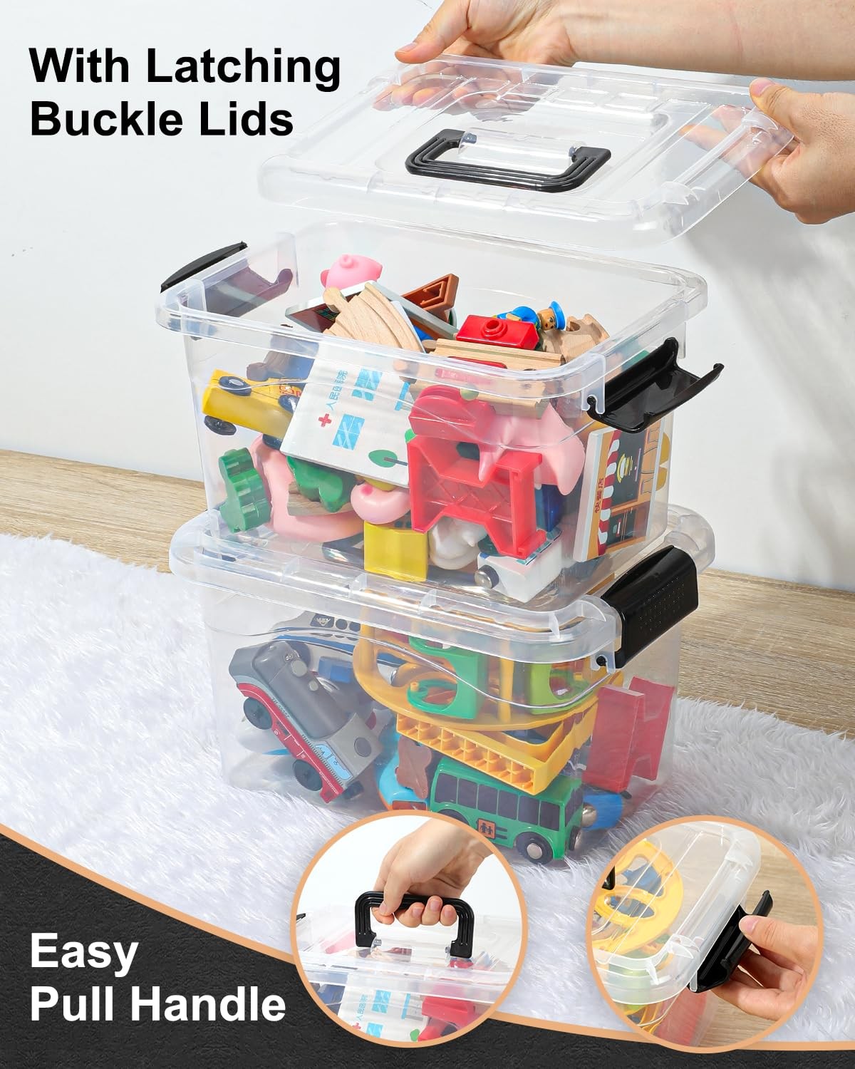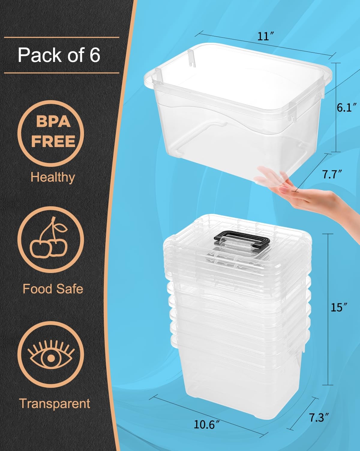 These clear storage containers for organizing help to keep your room tidy and clean. These small plastic storage bins can be used as closet storage bins, kitchen organizers and storage, shoe boxes, classroom organization essentials baskets and much more. 【Dimensions】: External dimensions:11L*7.7W*6.1H inches; Internal Dimension:9.6L*6.6W*5.7H inches. 【BUILT TO LAST】: These sturdy, long-lasting clear storage bins are made of high-quality BPA FREE material, which make these plastic storage bins keep for long-term use and safety. 【SNAP ON LIDS DESIGN】:Our clear storage bins make it easy to see the contents without opening them. Top which keeps your storage items dry and dust-free.The clear material, blak handles push down latches make them both elegant and easy to use. 【STACKABLE STORAGE:】: Design with groves on the lid and body to create a secure stacking experience. The stackable construction of these clear organization and storage ensure stability to stack securely for easy moving, and save space in your house, apartment, and condo. 【SEE-THROUGH DESIGN】: No more looking for your precious stuff. The see-through design of these plastic classroom organization allows you to find any stored items instantaneously from any angle..they are not only space-saving, but also have a neat appearance. 【MULTI-PURPOSE USE】:These plastic school box help to keep your room tidy and clean. These small plastic storage bins can be used as closet storage bins, kitchen organizers and storage, shoe boxes, child / kid room toy bins, classroom organization essentials baskets and much more. 【SATISFACTION GUARANTEED】:Storage bins are great for Birthday days, Mother's Day, Father’s Day and Christmas,We value your satisfaction above all else. If you have any questions, comments or concerns, please feel free to contact us.
