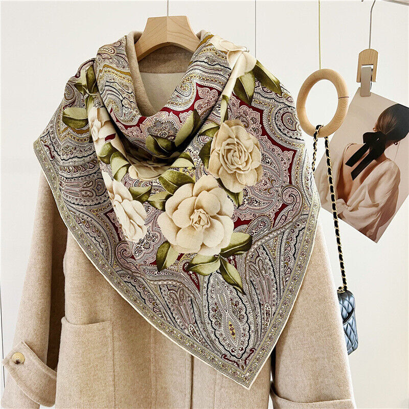 This scarf is incredibly soft and luxurious—the perfect blend of cashmere and silk makes it lightweight yet cozy. The double-sided print adds elegance, and the hand-rolled edges give it a polished look. It drapes beautifully and feels delicate against the skin. Just spot clean to maintain its quality. A stylish, high-end accessory without the designer price tag!