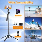 【Quadruped Selfie Stick Tripod】Newest selfie stick phone tripod has greatly improved the stability and user experience when taking photos/videos. Upgraded 4-point support, combined with the dock metal ribs and aluminum alloy telescopic pole, provides better balance and weight-bearing than normal tripods. No more worrying about the stand falling over even when carrying large and heavy phones. 【360°Rotating Balance Handle & Multi-use Mount】You can easily find the best shooting angle with this tripod, to achieve 360°panoramic shooting, 180°up and down shooting. Just take photos/videos with excellent stabilization while freeing hands. You can also attach an action camera or ring light, which makes it not only a phone tripod stand but also a sport camera/ ring light stand(GoPro adapter included). 【Portable Pocket Sizes & Expandable Tall Tripod】 Our lightweight travel tripod only about 0.94 pounds weight & mini to 11.6 inch folded size. The using height of the cell phone tripod can be easily expandable up to 71 inch, no need to twist or lock, just simply stretch the stick to adjust it and set your most satisfying wide-angle selfie. The mount range of the tripod phone holder is about 2.4-3.9inch in size, which is suitable for 4-7'' phones. 【Type-c USB Rechargeable Wireless Remote Shutter】Liberate your hands and enjoy taking pictures remotely with our selfie stick tripod with remote. It will keep stable up to 33ft/10m and is compatible with most smartphones such as Android and iPhone. Now the remote is upgraded to rechargeable with type-C cable, no need for spare batteries anymore! 【Wide Compatibility & Best Gift】This compact selfie stick with remote is versatile, the fold length is only 11.6 inch, short enough to fit on a desk, tall enough to fit your height, easy to carry, and can be used when traveling or hiking. It's the perfect gift for anyone who likes photography. 【Notice & Customer Service】The remote only supports use for phones. For other devices, please equip supported remote control by yourself. Customer satisfaction is the pursuit of selfie stick tripod. If you have any questions, please feel free to contact us by email, and we will solve your problem.