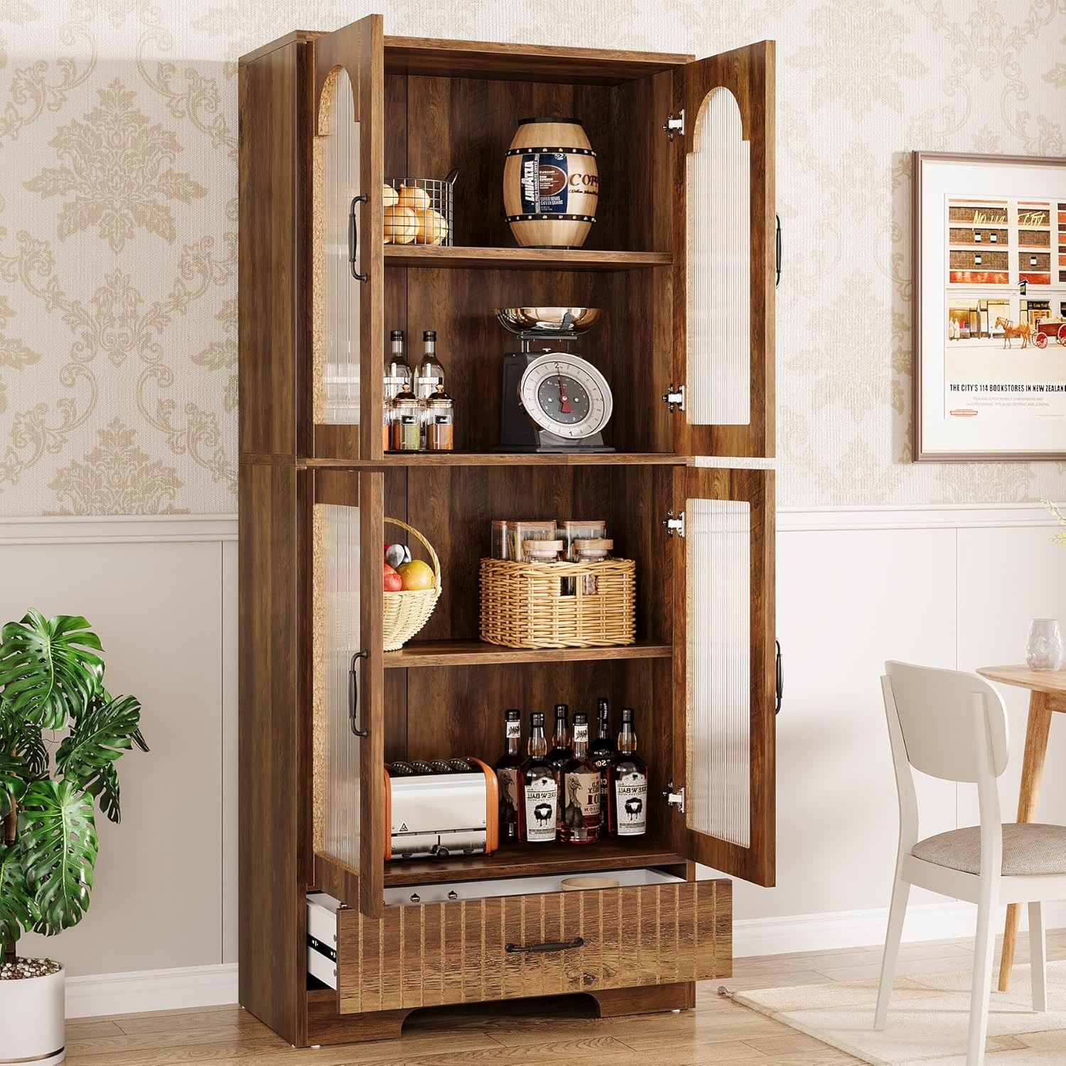 Product Description About this item Large Storage Capacity: This tall pantry cabinet includes two adjustable-shelf cabinets and a large drawer for plenty of storage. You can easily customize the storage spaces to accommodate items of different sizes and keep your area clean Versatile Cabinet: Finished in a timeless vintage brown color, this food pantry cabinet adds a touch of elegance to your space, making it a perfect fit for any decor style, whether in the living room, kitchen, or dining room Optimize Kitchen Space: This kitchen cabinet offers you a dedicated storage space where you can keep various tableware, cooking ingredients, and supplies. It helps to keep your kitchen essentials well-organized Sturdy and Stable: Constructed from quality engineered wood, this storage cabinet features a classic wooden frame and sleek acrylic doors, offering both storage and display capabilities. A tip-over restraint device is included for added safety Easy to Assemble: All parts are labeled for easy identification. The tools and user manual are included. Please follow the instruction step by step to finish the installation. To maintain its look, simply spot-clean it with a dry cloth Tall Kitchen Pantry Cabinet with Storage Drawer and Acrylic Doors This storage kitchen pantry cabinet is a versatile and elegant addition to any home, combining functionality with a stylish design. Constructed from engineered wood, it features a classic wooden frame and sleek acrylic doors, offering both storage and display capabilities. The drawer provides convenient access to cutlery, while the cabinet boasts an adjustable shelf, allowing you to customize the space to fit needs. Previous page It features sleek acrylic doors, offering both storage and display capabilities. Boasts adjustable shelves allowing you to customize the space to fit your storage needs. The bottom storage drawer provides convenient access to cutlery. Next page On Aug 6, 2025 at 19:36:30 PDT, seller added the following information: