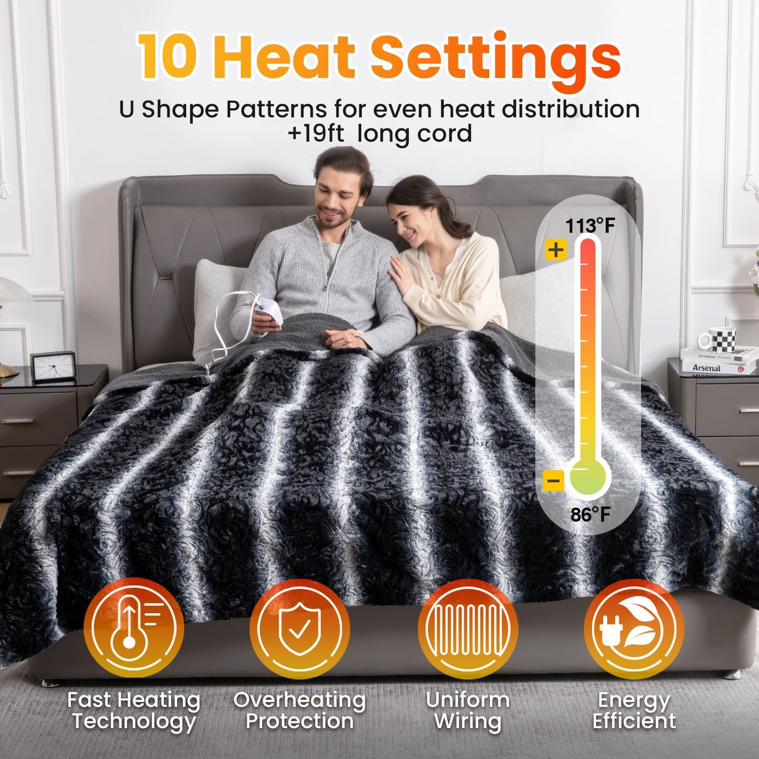[Spring Blossom Collection with Flower Patterns] Elegant Faux Fur, with a plush Sherpa reverse, combines unmatched warmth with stylish home decor functionality. [Safety is Priority] Set personalized timers with the 0.5-12h auto shut-off for worry-free naps or sleep. ETL certified with overheat protection, ensuring safe use for both children and adults. Plus, it's machine washable. [Customize Your Warmth] Effortlessly choose from 10 heat levels, setting your ideal temperature between 86°F and 113°F. Enhanced with upgraded double-layer heating wires, guaranteeing efficient, safe, fast, and even heating. [Gift Box Design] This beautifully crafted gift box, adorned with chic floral patterns and charming decorative elements, makes it the perfect present for your loved ones during the chilly holiday season. [Hassle-Free Purchase] Enjoy reliable and warm after-sale service on our electric blanket, with assurances of prompt responses to all inquiries. Product Description The video showcases the product in use. The video guides you through product setup. The video compares multiple products. The video shows the product being unpacked. Personalized Heat for Ultimate Comfort 10 Adjustable Temperature Use the controller to easily switch between the 10 heat levels from 90℉ to 108℉. 0.5H-12H Auto-off Reservation Set from 0.5h to 12h Auto-Off to reserve the length of your heating time. 1 Warm Pro 2 Advanced Heating Tech 3 Machine Washable