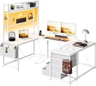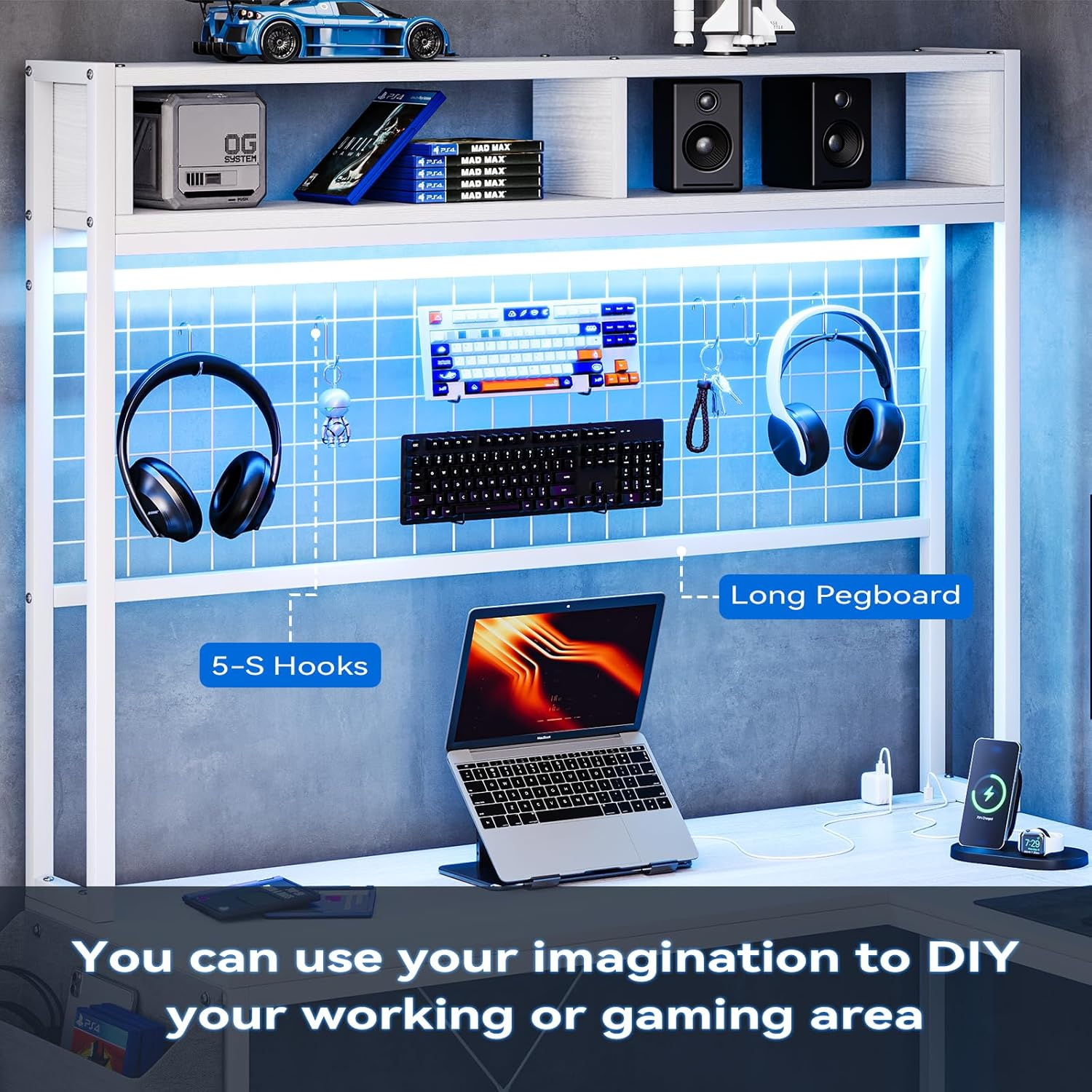 【Multi-Functional U-Shaped Gaming Desk】 This versatile U-shaped computer desk features an ergonomic display stand, side storage rack, and 4 fabric drawers to meet all your workspace needs. The top hutch provides ample storage for documents and supplies, while three spacious desktops offer plenty of surface area for gaming and productivity tasks, creating a functional and organized workspace. 【Dynamic RGB LED Lighting】 Transform your workspace with app-controlled RGB LED strip lights that offer 60,000 colors and dynamic modes. The music sync feature changes colors to the rhythm of your tunes, enhancing your gaming or work environment. Set automatic on/off schedules for added convenience, creating a vibrant atmosphere tailored to your preferences. 【Enhanced Ergonomics & Power Support】 Designed for comfort, this U-shaped desk includes a flexible monitor stand that promotes ergonomic viewing angles to reduce neck strain. It also features 4 power outlets and 2 USB ports, providing convenient charging for your devices and ensuring you have the power you need for computer peripherals and gaming gear during extended sessions. 【Stylish & Functional Grid Design】 The unique grid design of this U-shaped office desk combines style with practicality. An under-grid bookshelf maximizes your space by providing storage for books and devices, enhancing organization and aesthetics. This modern furniture piece complements any home office setup while maintaining a clean and organized look. 【Sturdy & Robust Construction】 Constructed from thick engineered wood and solid metal legs, this U-shaped desk offers exceptional stability and a load-bearing capacity of up to 600 lbs. Its durable design ensures long-term reliability, making it an excellent choice for both gaming setups and professional workstations that require a dependable and stylish workspace. Product Description