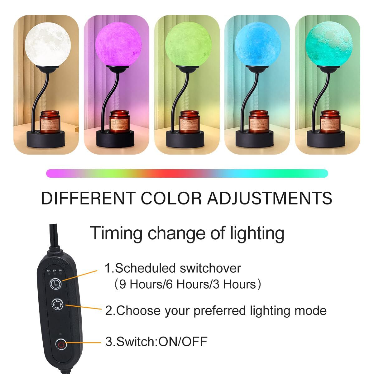 This style of Candle Warmer Lamp is a captivating fusion of indoor lighting and fragrance. Its seven shades of ever-changing colors can be adjusted to suit your mood and needs, offering a variety of atmospheres, from warm orange to serene blue, providing limitless options. It infuses your living space with 100% pure natural fragrances, allowing you to indulge in the scents of nature. Utilizing electronic heating technology, the Moonlight Wax Warmer ensures stability and safety, eliminating concerns about open flames. It also features a timer function, allowing you to set run times for 3, 6, or 9 hours according to your convenience, enhancing your experience for added comfort. The Moonlight Wax Warmer is an ideal choice for American households, adding a touch of charm to your space and creating a warm, serene, and unique ambiance. It will enchant you with the allure of light and fragrances, serving as the perfect complement to your cozy corner. ALL YOUNEED IS INSIDE: Timed power cord, water dish, Moonlight lampshade, Water bowl: 45 ml Material: Metal, Glass, Resino 【Energy-Efficient Electronic Chip Heating】 We employ state-of-the-art electronic chip heating technology, the candle warmer lamp consuming a mere 5W of power, which is just a fraction of the energy required by traditional filament bulbs. This technology not only ensures enhanced stability and safety but also facilitates swift wax melting while being remarkably energy-efficient. Say goodbye to open flames, smoke, ash, and pollution, as it reduces the risk of fire. Experience a cleaner and more ef 【Timed Multicolor LED Design】 the candle lamp is equipped with seven color-shifting LED light sources, boasting a lifespan of up to 50,000 hours, sparing you the hassle of frequent bulb replacements.Aesthetic lamp introduces the authentic glow of the moon into your living space,It is a very good aesthetic decorative light, offering a range of lighting options, including white light for your everyday illumination needs like work and reading. The candle warmer with timer lets you effortlessly set 【3D Printing Technology】 Leveraging cutting-edge 3D printing technology, our moon lamp's surface closely mirrors the genuine moon, exuding a unique and bedroom decor aesthetic allure while providing a variety of lighting choices. 【Long-Lasting Aromatherapy】 This electric candle warmer employs heat to uniformly melt wax, instead of traditional candle burning, resulting in a fragrance duration twice that of burning candles.The candle melting lamp accommodates most types of jarred or wax melts. Additionally, we include a 45ml glass dish for use with 100% natural essential oil blends and ambient light to establish an enchanting ambiance. 【Versatile Application】This moon candle light warmer is exceptionally suitable for use as a aesthetic lamp or mom gifts on occasions like Valentine's Day, Christmas, Thanksgiving, birthdays, parties, weddings, and anniversaries. Not only does it augment the charm of your living space, but it also serves as a distinctive gifting option. Revel in the delightful scents of your preferred jarred candles.