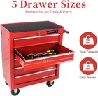 Features: 【100% Brand New Quality】 【Large Capacity】 - Equipped with 5 drawers of 10.8"D×20.0"W×3.9"H, the rolling tool chest creates more ample storage space for all your tools. And the flat top also provides extra space for your frequently used tools and parts. 【Durable Material】 - Our tool cart is carefully polished and powder-coated to ensure wear and rust resistance and will not chip paint. Made of high-quality steel, the structure is strong and stable, which greatly improves the durability. The drawers use ball bearings for smoother opening and closing. 【Multi-Purpose】 - 1 tubular handle, 4 heavy-duty wheels, 2 of which are with brakes, improve the mobility so that the tool cart can be easily moved to any position you want. Our rolling tool box is suitable for garage, warehouse, workshop, repair shop and other places, widely used in gardening and auto maintenance. 【Storage Organizer】- Large storage space, easier mobility features, multiple color options, comes with lock to protect the tools, with excellent functionality and appearance, the tool cabinet will be a good choice for storage in the workshop or at home! 【Easy to Assemble】 - Pre-drilled mounting holes allow for easy assembly in a short time. If you have any questions about the item, please feel free to contact us, we will provide you with 24/7 help. 【Good After-sales Service】 If the damage occurred in transit or the product is broken, please take a photo and contact us, we will solve all the problems for you. Have a nice life! Note: Product colors may vary slightly depending on the phone screen. It is just a very small difference. Size: 12.9"D x 24.2"W x 29.9"H Specification: 5 Drawers Rolling Tool Chest with wheels Our rolling tool box is made of precision cut steel for durable construction and great mobility. The surface is processed by anti-rust paint coating, which is more wear-resistant and easy to clean! With stylish appearance and sufficient capacity, the tool chest can be used in garages, warehouses, workshops, repair shops and other places, which is the best choice for storing all your tools! Just enjoy this tool cart with wheels to customize your own tool organization system and get ready to work! Main Specifications Package: 1* Rolling Tool Chest with 5-Drawer Tool Box 1* Instruction Books 🥇 Please check if your address is correct, we cannot change the address once sent. ●Delivery details 🚚 We have 3 warehouses in the United States: LA warehouse, NY warehouse, CA warehouse; when the warehouse near you is out of stock, we will use the warehouse far away from you to deliver the goods. 🚚Shipping from the United States, door-to-door delivery by UPS or FedEx.1-3 business days with tracking number provided. 3-12 days delivery. It depends on logistics and shipping. Sometimes there may be delays. 🚚We cannot ship to PO Box/Hawaii/Alaska/Puerto Rico/APO ●Return Policy ❤️ 1. We generally do not accept returns! ❤️ 2. If there is a problem with the product quality or it is damaged during transportation, you can contact us by email. I can replace it with a new one for you free of charge. Please do not make a return request lightly. Thanks. ❤️ 3. You can easily contact us by email and we will reply you within 24 hours, except holidays. ❤️ 4. We are more than happy to answer any questions you may have, please contact us via email. ●About Fundiy 👍 1. We hope to be a 100% satisfied seller. 👍 2. We provide high-quality after-sales service, you can contact me at any time. 👍 3. We have extremely fast response to deal with your problems. For example, if the product has quality problems or the product is damaged during transportation, please contact us 👍 4. Please give me ⭐⭐⭐⭐⭐feedback! Thank you!