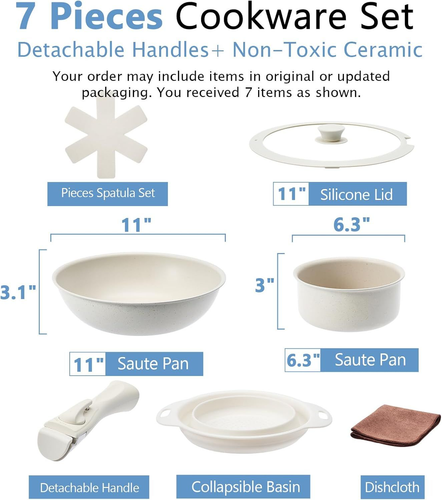 7-Piece Non Stick Ceramic Cookware Set with Detachable Handles, Induction & Oven Safe Pots and Pans Set, Non Toxic Pan Set for Cooking, Includes Pan Protectors Product Details Material: Aluminum Color: Cream White Brand: Boryenty Size: Mixed Handle Material: Bakelite with silicone Is Dishwasher Safe: Yes Material Type Free: PFAS Free, Perfluorooctane Sulfonate (PFOS) Free, Perfluorooctanoic Acid (PFOA) Free, Polytetrafluoroethylene (PTFE) Free Compatibility Options: Compatible Number of Pieces: 7 Closure Material: Glass Is Oven Safe: Yes Cookware Set Is Compatible With: True With Lid: Yes Manufacturer: Boryenty Utensil Compatibility: Metal, Wood, Silicone, Plastic Is Cookware Induction Compatible: Yes Manufacture Year: 2025 Special Feature: Non Stick Package Dimensions: 12 x 12 x 5.7 inches Item Weight: 4.4 pounds Item model number: White-7pcs 【Space-Saving Cookware Set – Stackable with Detachable Handles】Maximize your kitchen storage with our 7-piece pots and pans set featuring removable handles and a stackable design—saving up to 70% of cabinet space. Ideal as an RV pots and pans set for camper, small kitchens, or compact apartments 【Non Toxic Ceramic Cookware – Safe & Healthy Cooking】Cook confidently with our nonstick cookware set crafted from toxin-free ceramic—100% free of PFAS, PTFE, PFOA, lead, and cadmium. These non stick pans offer a smooth, scratch-resistant surface for healthy, oil-free meals—no Teflon needed 【Oven Safe & Induction Compatible – All Stovetops Covered】This non stick pot and pan set works on induction, gas, electric, and ceramic cooktops, and is oven-safe up to 480°F. Whether you're sautéing, simmering, or baking, these nonstick pots and pans deliver reliable performance every time 【Quick Cleanup – Inside & Out Double Nonstick Coating】Our nonstick frying pans and saucepans are coated inside and out for effortless cleaning. Food releases easily, so you can wash by hand or place them in the dishwasher—perfect for busy home cooks and families 【Complete Non Stick Pan Set with Pan Protectors】This ceramic cookware set includes frying pans, saucepans, removable handles, and pan protectors. A modern beige finish suits any kitchen decor. Great as a camping pots and pans set, or as a space-saving kitchen cookware set for everyday cooking.