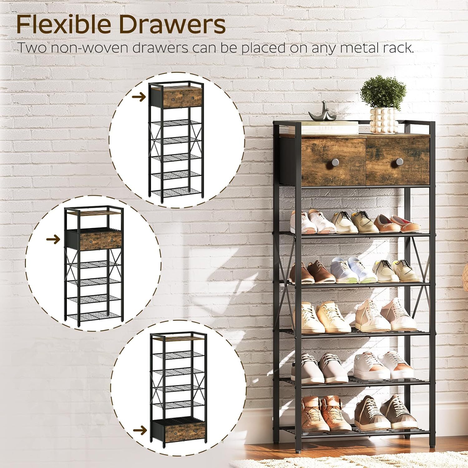 Spacious Drawers: This shoe rack has 2 non-woven drawers, offering ample storage space for shoe polish, shoe brushes and shoehorns, etc. The flexible and ingenious design of shoe organizer allows for easy relocation of the drawers to any layer of the shelf 7-Tier Shoe Organizer: The sturdy shoe shelf is 46.9'' high and composed of 6-layer metal mesh shelves and 1-layer wooden top. With upright design, the shoe rack optimizes the use of vertical space for shoes, boots, and daily sundries, creating a tidy entrance area Quality Shoe Rack: This shoe storage organizer is constructed of particleboard and metal with X-shaped bars on both sides for enhanced stability. Its top and each tier of metal mesh shelves can support up to 33 lb and 22 lb respectively, providing reliable storage Rustic Industrial Style: Our shoe rack garage organizer exudes a strong industrial vibe, featuring a black frame embellished by a rustic brown top panel and drawers. The combination of classic and stylish elements adds a touch of chic charm to any home space Craft Time: All numbered accessories, a detailed illustrated manual and the required installation tools are included. Follow the manual, and you'll complete the assembly process in no time. We recommend the use of the anti-tip device to enhance overall safety of the shoe rack