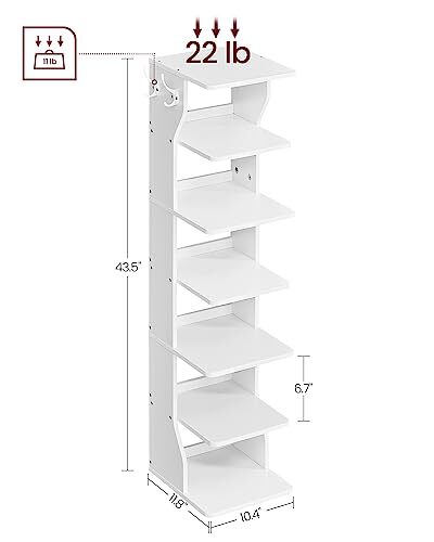Return Policy Fast Delivery Trusted seller 7 Tier Vertical Shoe Rack, Narrow Shoe Storage Organizer with Hooks, Slim Wooden Corner Shoe Tower Rack, Robust and Durable, Space Saving for Entryway and Bedroom, White ULBS200T14 Product Description [Fits Tight Spots] Shoe storage in the doorway? Trinkets or plants display in the narrow hall? Wver storage is needed, this 11.8”D x 10.4”W x 43.5”H shoe tower will fit the bill while taking up little floor space [Hang Accessories Up] Hang your keys and wallets on the hooks of this corner shoe shelf for a quick grab and go during the morning rush. Even better, the 2 hooks can be installed on the left or right as you need [Holds Taller Shoes] Loafers, sneakers, hiking shoes, boots...all of them can be well accommodated on the shelves with 6.7 inches between each, tall or short [Offers Strong Support] Crafted with particleboard, this corner shoe rack boasts great strength (max. 22 lb load for each shelf), so you can set heavy climbing shoes on with ease [What You Get] A 7-tier slim shoe rack with backboards to add stability and protect your wall from scuffs, plus an anti-tip device to help you secure the shoe tower to the wall for safety Shipping Returns Payment Shipping Shipping is FREE to all addresses other than APO/PO boxes in the lower 48 states. All our stock ships from US-based warehouses. Shipped via USPS or UPS (depending on location and package weight) Unless stated otherwise, all orders will ship within 24-72 hours of your payment being processed. Check our feedback to see the great reviews of FAST shipping we offer. Returns Seller does not accept returns Payment We currently accept payment via eBay managed payments only. Once payment is cleared, we will dispatch your shipment within 1-3 business days. Please refer to the "Shipping" tab for more information regarding shipping speed to your destination.