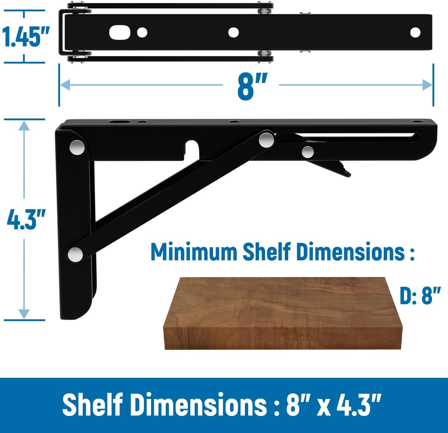 Efficient Space Utilization - The folding brackets offer a space-saving solution that allows you to free up more room in various settings such as garages, kitchens, shops, stores, workshops, boats, motorhomes, backyards, trailers, rooms, balconies, and bathrooms. Simply mount these fold-able brackets on your walls. Robust & Enduring - Crafted from high-quality premium grade steel and coated with a resilient baked black paint finish, these brackets ensure remarkable durability and resistance. This protective baked black paint treatment enhances its capacity to withstand daily wear, scratches, and corrosion. Simple Installation and Usage - Equipped with a lock for securing the folded table position, a wall mounting option for flush installation, and the ability to be fixed on 25/32 mm radius pipes, these brackets are user-friendly and versatile. The integrated hinge mechanism ensures that the flap automatically locks when opened and can be easily released by pressing the lever. Effortless Installation - Mounting the shelf brackets is a breeze; just ensure they align accurately with the studs during installation. The package includes mounting accessories, premium stainless steel screws, and high-quality anchors, ensuring a secure attachment. Product Description Meet this LEOPO L type shelf bracket design that blends with both contemporary or rustic styles and it’s versatile to fit any room of the house. · Folding Shelf brackets · Wood Wall Screws · Wood Board Screws · Concrete Plastic Expansion Anchors · Installation Instructions *NOTE: Please use our guide for proper installation. Easy to Install An enlarged hole has been designed for easier screw fixing 90°Fixation Innovative lock, versatile mounting options, and intuitive release mechanism for seamless use. Installation Guide Comes with step by step instructions for easy installation.