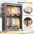 Product details: 【Clothes Rack with Cover 500 LBS Bearing Capacity】The clothing rack has 3 shelves and 2 hanging rods, which can hang about 150+ summer clothes or 80+ winter clothes. Single hanging rod can support up to 44 LBS, wire shelf can support up to 176.5 LBS for each. Raybee heavy duty clothes rack suits different place: bedroom, cloakroom, clothing store, laundry room, corners, walk-in closet etc. 【Quality Clothing Rack can be Used in Multiple Situation】: The clothes racks are equipped with a window dust cover and two options for supporting feet. When moving this garment rack, you can choose 360° rotating wheels, designed to allow you to roll this garment rack anywhere you need in your home, and two of the wheels are lockable, so you don't have to worry about the closet will run on its own. You can also use adjustable feet to support the clothes rack to meet your various use needs. 【Sturdy & Durable Heavy Duty Clothes Rack】 The thickened pipe makes Raybee clothing rack more stable in structure, it is sturdy enough with adjustable feet. It won't tip when it is placed inside a closet, but anti-tip straps are provided if you need them. Raybee heavy duty clothes rack is a good DIY portable clothes rack meets all your needs. 【Garment Rack Cover with Triple High-Quality Zippers】The clothes rack cover adopts a new three-way zipper design, allowing the front cover to be opened leftwards, rightwards, or completely opened, making it easy to retrieve and place items inside the clothes rack. After fully opening, use the fixed straps latch on the side of the frame to keep it in the open position. The clear and visible window design makes it easy for you to take out clothes. And you can zip your clothes rack cover closed to keep your private space if you have visiting guests. 【Configure the Clothes Rack as You Like】Raybee clothing rack is adjustable, as you can put the shelves or rods wherever you think works the best for your situation. Each shelf or hanging rod is detachtable, for example, you can remove the lower hanging rod to hang long skirts. 【Tool-free Assembly in 10 Min & Sweet Service】Easy to assemble with clear instruction, no-nonsense design for effortless use. No nuts or bolts are required, saying goodbye to complicated setups and enjoy hassle-free operation. You don't have to worry about scratches on the floor of metal storage rack, which is a good choice for your home. There are straps to hold the cover and clothes rack in place. We suggest that you install the clothing rack cover first before installing the anti tipping set. Brand Raybee Color Black Material Metal Recommended Uses For Product Clothes display + storage rack for hanging and placing various types of clothes, shoes, bedding, accessories and other heavy items. The hanging space is suitable for hanging all kinds of clothes: coats, skirts, pants, shirts, ties, umbrellas, etc. The shelves are suitable for visitlng all kinds of items: shoes, dolls, quilts, books, decorations, ect. Product Dimensions 17.5"D x 45"W x 81"H