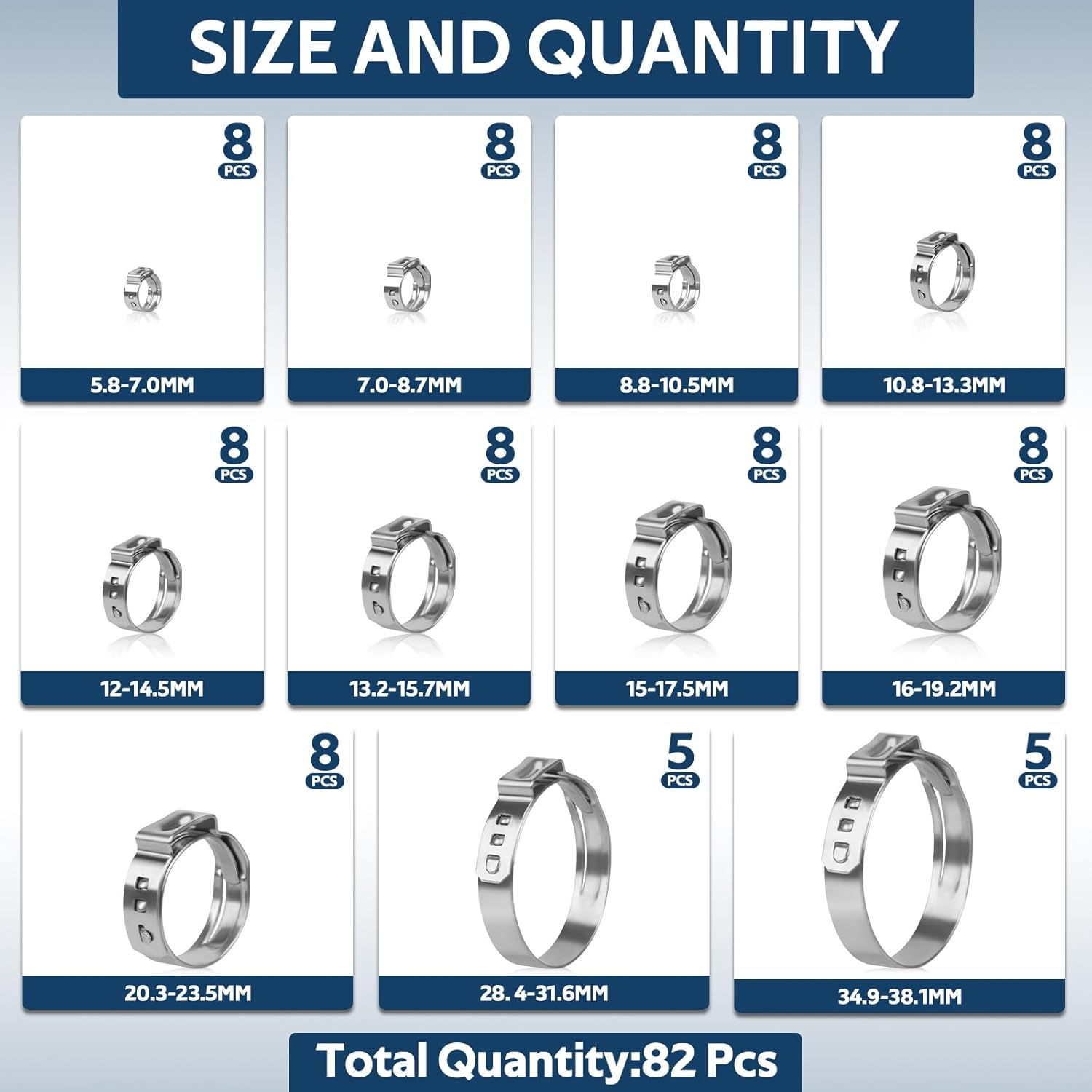 Store New Arrivals Add to Favorite View Feedback Contact 82 Pcs Single Ear Hose Clamps, 11 Sizes 5.8-38.1Mm 304 Stainless Steel Ear Crimp Description Item model number Ear Hose Clamp 01 Style Industrial Color Silver Country of Origin China Batteries Required? No Item Weight 9.6 ounces Package Dimensions 4.84 x 4.76 x 2.05 inches Included Components Ear Hose Clamp PREMIUM 304 MATERIALS - Our single ear hose clamps are 100% made from 304 stainless steel material, which are resistant to heat, abrasion and corrosion, oil and oxidation to ensure these clamp rings can be used in a variety of extreme environments, providing long-lasting performance. SECURE AND TIGHT CONNECTION - The fuel line clamp kit feature narrow band cochlear design with no internal gaps allows for a more concentrated clamping force that provides a stronger, tighter connection, prevents leakage, and ensures optimal function in your plumbing or automotive applications. SMOOTH FINISH - Each clamp ring is finely polished to present a smooth finish, protecting your hose from damage and abrasion. The chamfered corners are rounded and smooth with burr-free edges that won't cut your hands during use. VERSATILE SIZING OPTIONS - You will receive 11 different sizes of ear stepless hose clamps to meet different needs in daily life. 5.8-7mm(8PCS), 7-8.7mm(8PCS), 8.8-10.5mm(8PCS), 10.8-13.3mm(8PCS), 12-14.5mm(8PCS), 13.2-15.7mm(8PCS), 15- 17.5mm(8PCS), 16-19.2mm(8PCS), 20.3-23.5mm(8PCS), 28.4-31.6mm(5PCS), 34.9-38.1mm(5PCS). Each size is stored separately which is very easy to find. WIDE APPLICATIONS - These pex clamps are used in all piping systems: they can be used for hose and pipe fixing for water pipes, water heaters, air conditioners, cables, etc. They can also be used for automotive, marine, industrial and mechanical use. 360° Stepless Clamp - Provides tight and reliable fixing Sturdy material: 304 stainless steel Abundant sizes: 11 different sizes. 5.8-7mm(8PCS), 7-8.7mm(8PCS), 8.8-10.5mm(8PCS), 10.8-13.3mm(8PCS), 12-14.5mm(8PCS), 13.2-15.7mm(8PCS), 15- 17.5mm(8PCS), 16-19.2mm(8PCS), 20.3-23.5mm(8PCS), 28.4-31.6mm(5PCS), 34.9-38.1mm(5PCS). Applications: Fixing hoses and pipes and for use in automobiles, ships, etc. ABOUT US We offer the best prices around on high quality products. Our E-store includes media such as books, movies, music and games while offering electronics, toys, sporting apparel, clothing, tools, general home, garden items and more. SHIPPING We are always working hard to ensure your package arrives as soon as possible. Please understand that some factors like weather, high postal traffic, and the performance of shipping companies are outside of our control. We offer free shipping to the lower 48 states and ship within 2 business days of payment, usually sooner. We do not accept P.O. Boxes. Please provide a physical address. For shipping outside of the continental USA, we only use eBay's Global Shipping Program.The item is shipped to KY and then sent to the rest of the world. International customers are responsible for all duties and taxes. Continue to check out in order to calculate costs for shipping the item to your country. Messages regarding eBay's Global Shipping Program MUST be directed at eBay EXCLUSIVELY. RETURNS We offer a 30-Day Return Policy on items which you are not completely satisfied with. You have the option for a full-refund or an exchange of the item. No returns are available on items shipped outside of the USA. PAYMENT We accept PayPal. CONTACT US This page content is yet to come Please ad us to your favorite seller and visit again later Thank You CUSTOMER SATISFACTION We try our very best to make sure every customer is completely satisfied. If there's a problem, message us! We're happy to help. WE ACCEPT Copyright © 2021 AutoDS. | All Rights Reserved