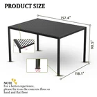 Product Information Main Color: Black Main Material: Aluminum Product Dimensions Item Length (in.): 118.00 Item Width (in.): 157.00 Item Height (in.): 90.60 Weight (lbs.): 525.00 Package Size Length (in.): 155.00 Width (in.): 22.00 Height (in.): 25.70 Weight (lbs.): 543.00 Product Features Premium Material Construction: The pergola is made of a powder-coated aluminum frame and a tilting louvered roof of galvanized steel that withstands up to 73 mph winds.Durable construction for year-round use Innovative design: a louver roof with adjustable angles lets you control outdoor light and ventilation.Effortlessly open or close the louver roof with a simple crank, adapting to changing weather conditions. Integrated Drainage System: Rainwater will be diverted to the columns through the built-in integrated drainage system, where it will be drained through the notches in the base of the posts. Endless comfort: our pergola creates the perfect outdoor leisure space, fostering cherished memories with family and friends.Ideal for gardens, backyards, parties, and commercial/domestic BBQ use. Multipurpose outdoor solution. Easy to Assemble: Prefabricated rails and Louvers require no special rivets or welds for assembly, and can be stably attached to the ground through the supplied expansion bolts. Attention: Do not allow snow to accumulate on the louver roof. If moderate to heavy snow is expected, open the louvers. In the case of high winds or other extreme weather conditions, open the louvers and raise or remove any shade screen accessories that have been installed to avoid potential damage to your pergola.