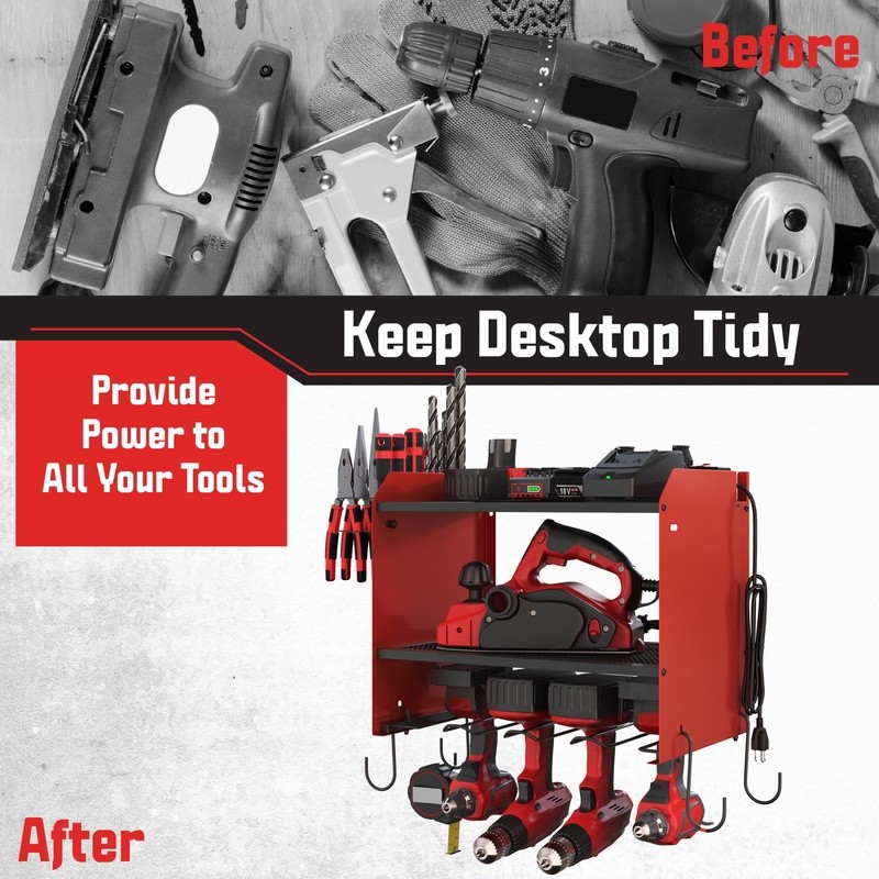 You may also like Durable Stainless Steel Tool Box W/ Removable Tray Organizing Compartment New 44.1 USD 46.42 USD Free shipping 5% off 3 in 1 Steel Rolling Tool Chest 6 Drawer 2 Cabinet Garage Organizer Heavy-Duty 210.25 USD 221.32 USD Free shipping 5% off Portable Tough Small Plastic Tool Box 13in Hardware Storage Equipment Workshop 10.16 USD 10.7 USD Free shipping 5% off TBTRAY1 Tool Box Tray Tool Box Service Part Sliding Plastic Tray Easy Access 36.14 USD 38.04 USD Free shipping 5% off Wall Mount Small Parts Organizer 8 Compartment Quick Release Heavy Duty Storage 42.27 USD 44.5 USD Free shipping 5% off 6 Drawer Rolling Storage Cart Wood Mobile Organizer Craft Office Supplies New 90.81 USD 95.59 USD Free shipping 5% off Professional Tool Box Liner Non Slip Mat Durable Drawer Shelf Liner Foam Sheet 58.88 USD 61.98 USD Free shipping 5% off Small Portable Tough Plastic Tool Box 13in Storage Hardware Workshop Equipment 10.16 USD 10.7 USD Free shipping 5% off Optimize your workshop or garage space with the Cordless Tool Organizer with Power Strip by . This wall mounted tool rack features a built-in 8 outlet charging station, 4 slots for hanging rechargeable tools, 2 shelves, 4 hanging hooks, and a drill bit rack. If that’s not enough space for your garage storage needs, you can connect a pair of these tool organizers to double your tool storage capacity. , for tool organization gifts for men that are SMART, STRONG, and SECURE. GARAGE TOOL ORGANIZER WALL MOUNT - Easily store and charge cordless drills and other power tools while keeping hand tools and accessories neatly organized with this 2-tiered power tool shelf. BUILT IN BATTERY CHARGING RACK - Power up your rechargeable tools right on this garage wall organizer, which features an 8 outlet power strip that delivers a 15-amp, 125VAC, 1875W/60Hz max load. VERSATILE TOOL HOLDER - This garage organizer wall mount has 4 power tool organizer slots for hanging rechargeable tools, 2 shelves, a side drill bit rack, and 4 hanging hooks. DURABLE CONSTRUCTION - The garage storage rack is made from heavy gauge steel with a 50lb capacity per shelf and a total capacity of 150lbs, and it comes with mounting screws and wall anchors for hanging. MATERIALS - Iron with Plastic Coating and ABS. DIMENSIONS - (L) 16. 5” x (W) 9. 1” x (H) 11. 8”; 8 Outlet Power Strip: (L) 14. 75” x (W) 1. 75” x (H) 0. 75”; Cord: 6’8”; Weight: 9. 48lbs; Power Tool Holder with UL 3 Prong Plug. COLOR - Red and Black. You may also like Bohemian Botanical Area Rug Soft Polyester Floral Indoor Carpet Low Pile Vintage 44.8 USD 47.16 USD Free shipping 5% off Medium Dog Deshedding Tool Non-Slip Handle Undercoat Grooming Brush Shedding Fur 17.32 USD 18.23 USD Free shipping 5% off Folding Bookcase 3 Shelf Wood Office Storage Furniture Durable Easy Transport US 70.38 USD 74.08 USD Free shipping 5% off Outdoor Bike Storage Shed Tent Waterproof Portable Cover 4 Double Door Gray New 100.11 USD 105.38 USD Free shipping 5% off Touchless Sensor Trash Can W/ Odor Filter Kitchen Office Hands-Free Use 76.5 USD 80.53 USD Free shipping 5% off Adjustable Manual Clay Pigeon Thrower Foot Operated Steel Portable Target 8223A 84.32 USD Free shipping Portable Calming Pheromone Diffuser Dogs Reduces Stress Behavior 30 Days New 29.22 USD 30.76 USD Free shipping 5% off Automotive Jump Starter W/ Air Compressor LED Worklight 260 PSI Emergency Tool 106.0 USD 111.58 USD Free shipping 5% off Meal Prep Glass Storage Container 4Cup Two Compartments BPA Free Microwave Safe 15.75 USD 16.58 USD Free shipping 5% off LED Makeup Mirror Freestanding 16 Dimmable Lights 180 Rotation Touch Control New 29.21 USD 30.75 USD Free shipping 5% off Chocolate Peanut Butter Meal Bar 5 Count High Protein Low Sugar Snack Fiber Rich 10.19 USD 10.73 USD Free shipping 5% off Armless Upholstered Accent Chair W/ Kidney Pillow Modern Graffiti Design New 96.59 USD 101.67 USD Free shipping 5% off